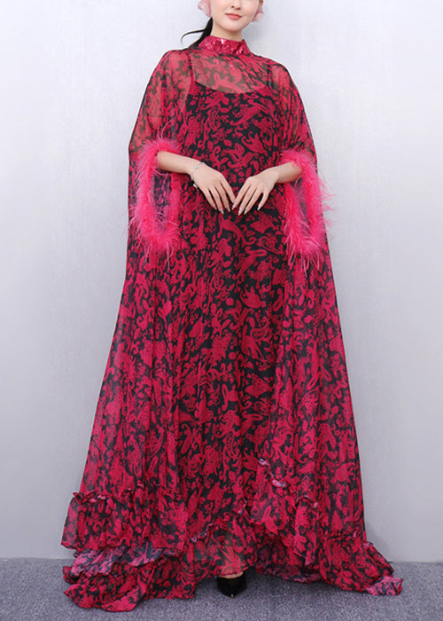 Beautiful Pink Flower Ruffled Chiffon Maxi Dress Batwing Sleeve