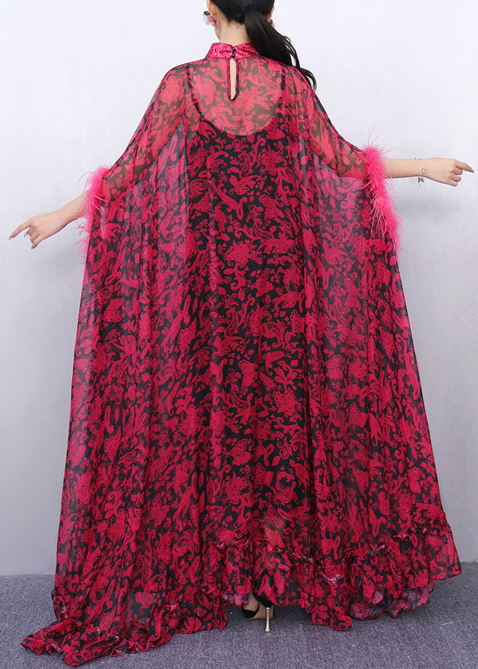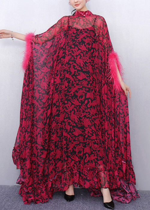 Red Ruffled Patchwork Glamorous Chiffon Two Piece Set Batwing Sleeve