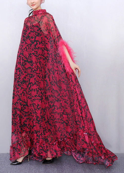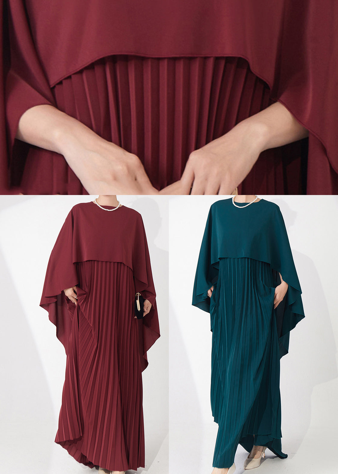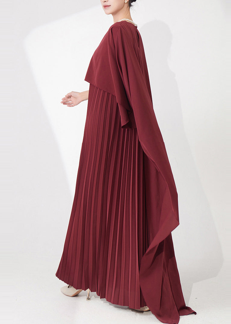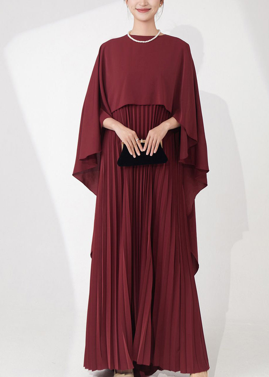 Retro Elegance Burgundy Cape-Style Pleated Dinner Gown Fall