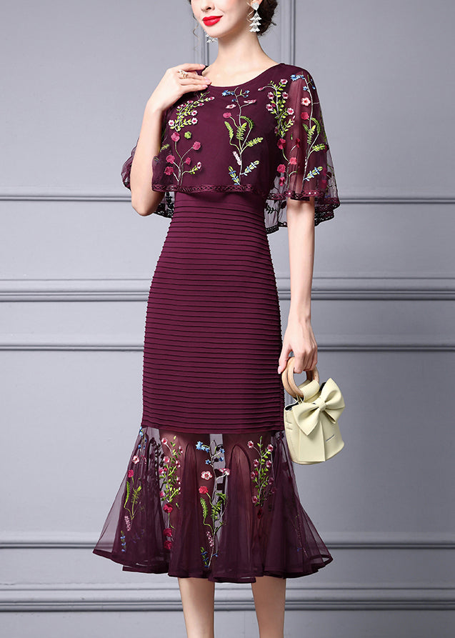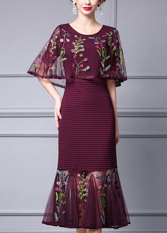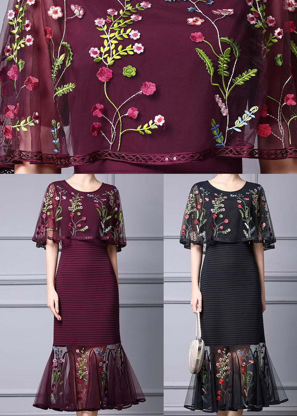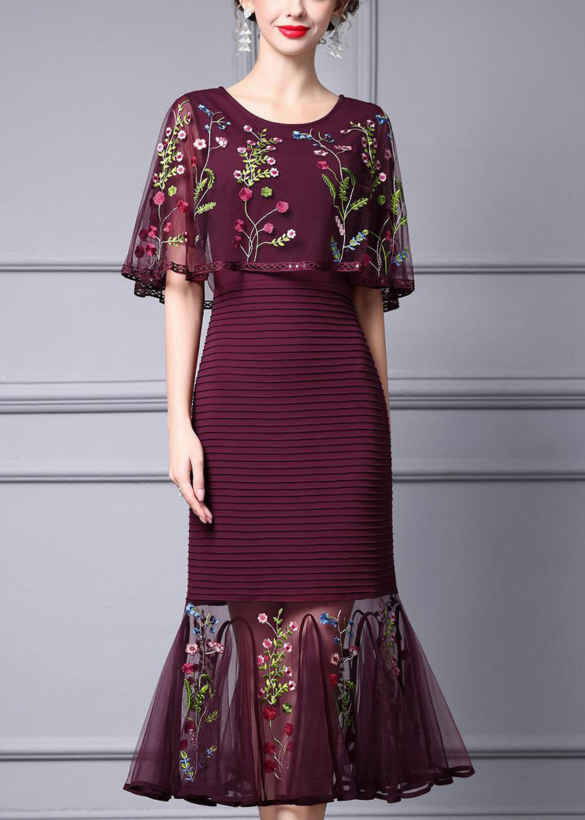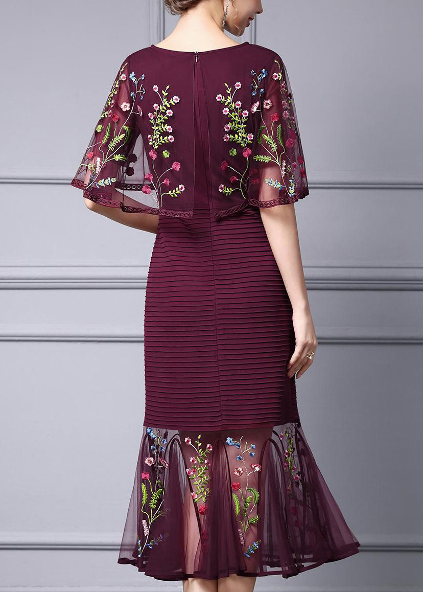 Elegant Mulberry Embroidered Floral Cape Style Party Dress Summer