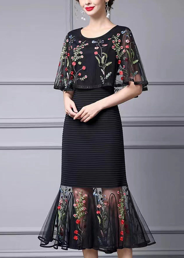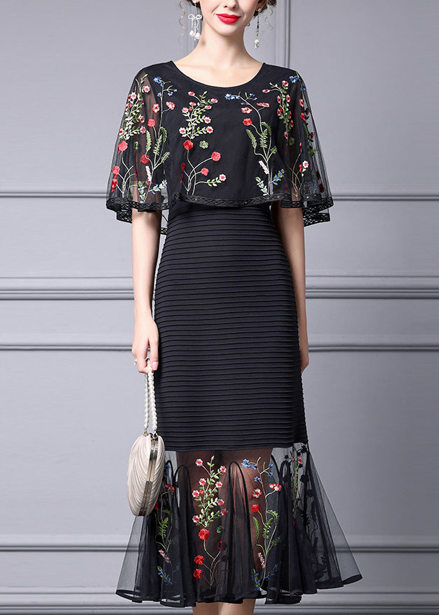 Fine Black Cape Style Dresses Multicolor Floral Embroidered Summer