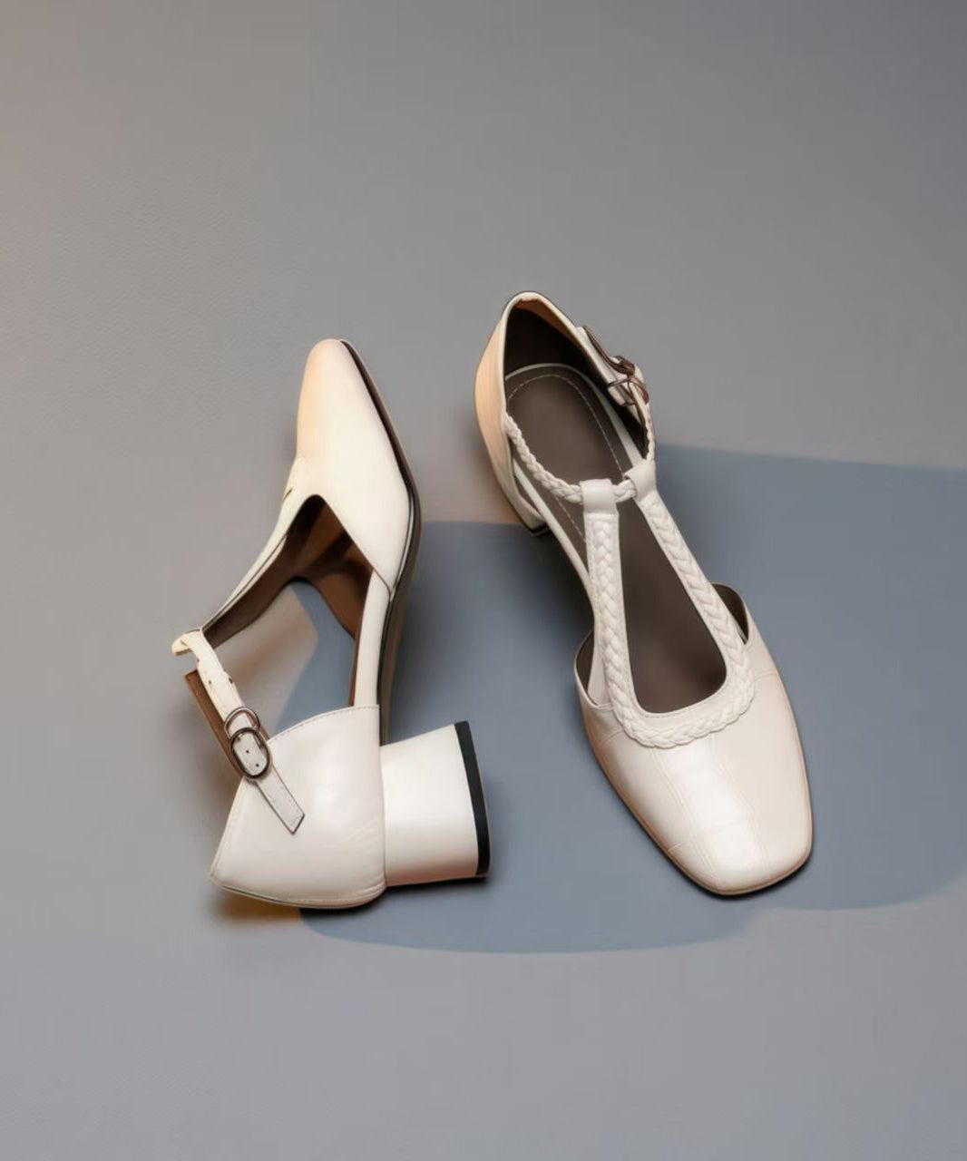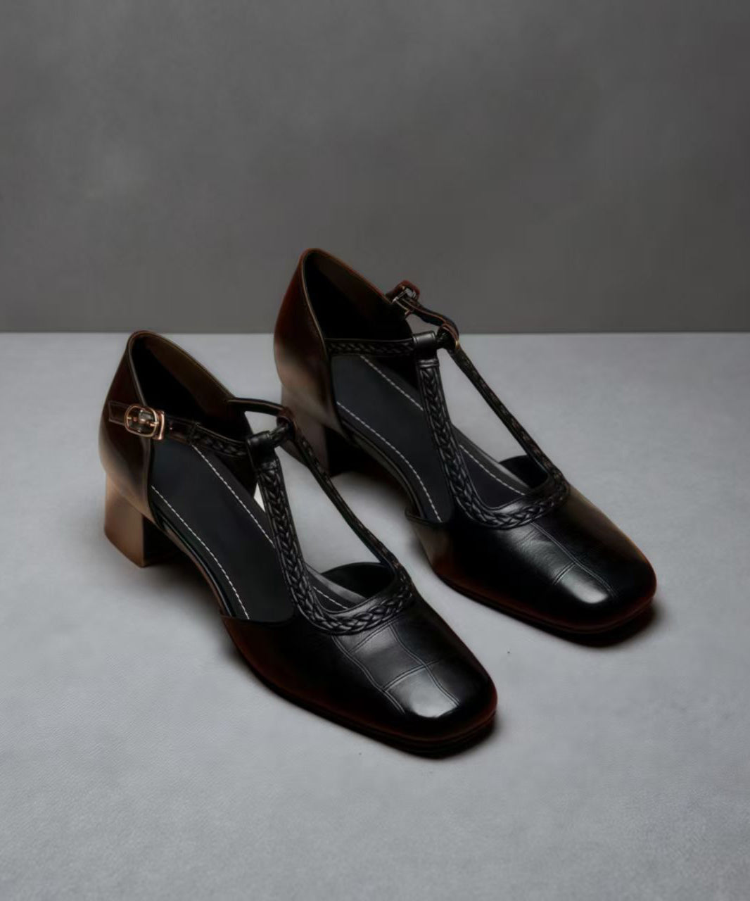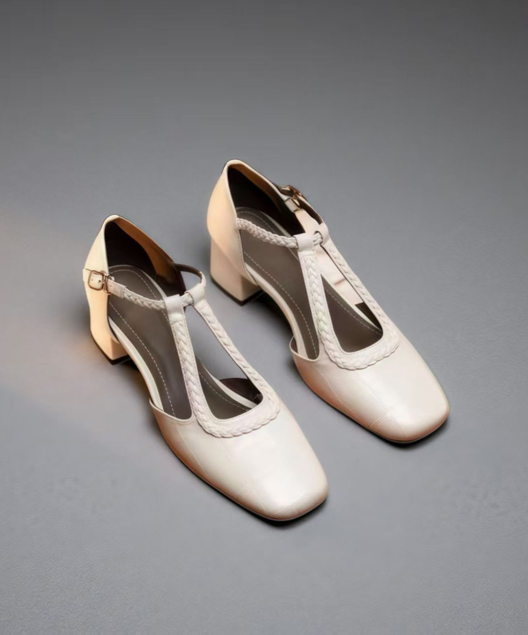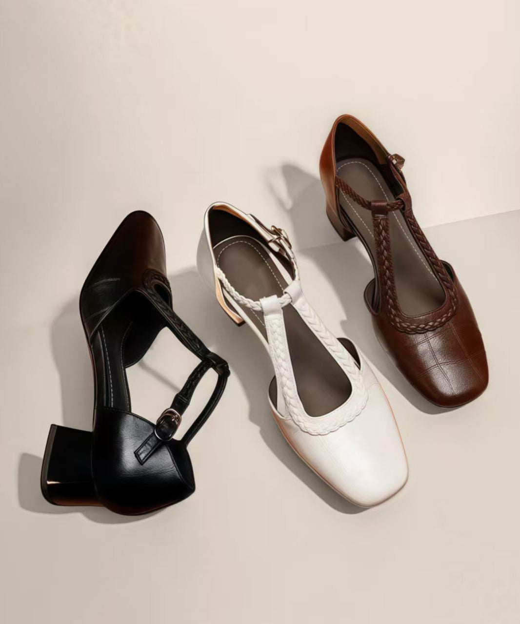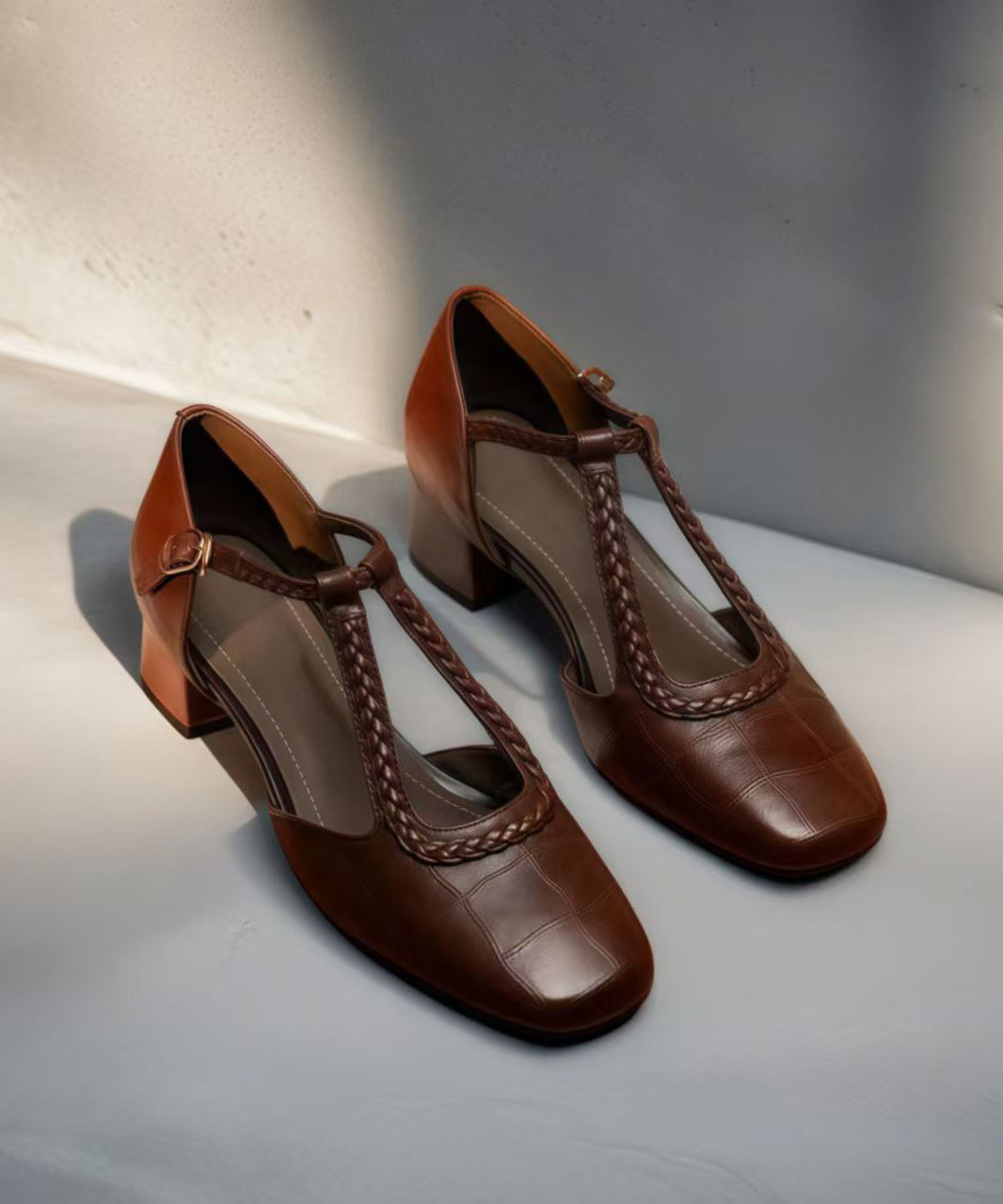 Brown Buckle Strap Splicing French Sheepskin Flat Shoes