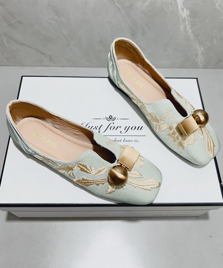 Handmade Splicing Penny Loafers Light Green Satin Embroidered