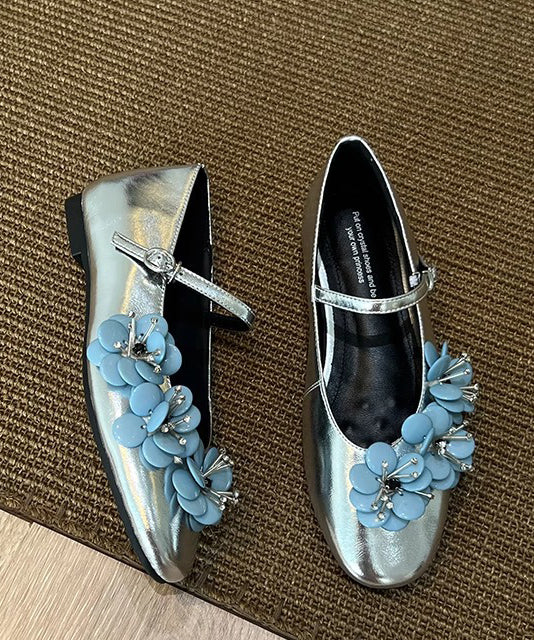 Silver Sheepskin Flat Shoes Splicing Floral Buckle Strap