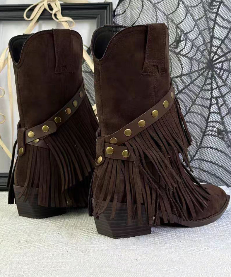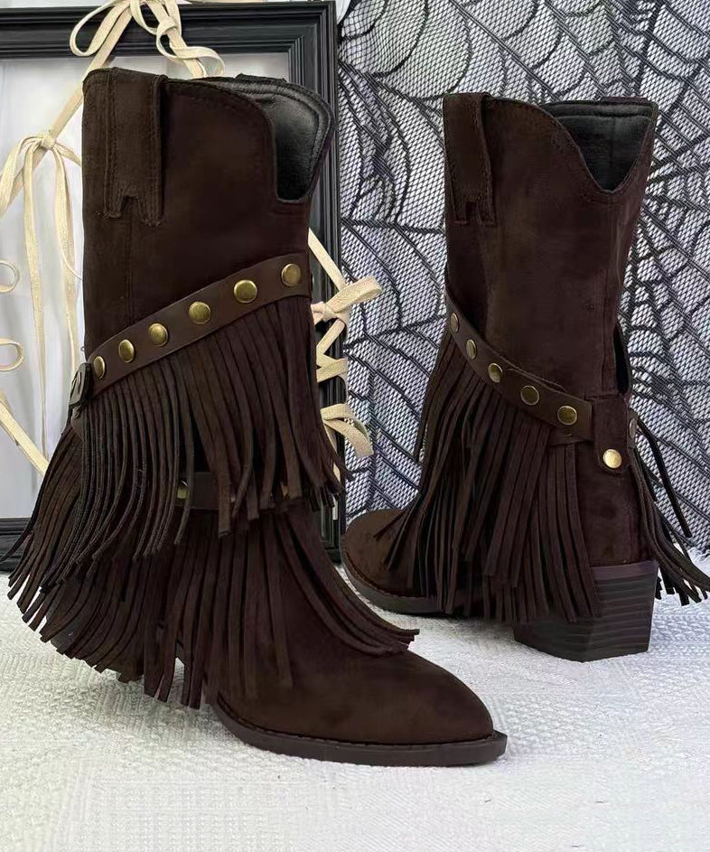 Bohemian Khaki Suede Tassel Splicing Boots Pointed Toe