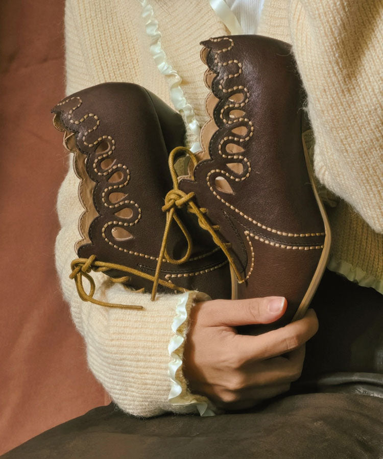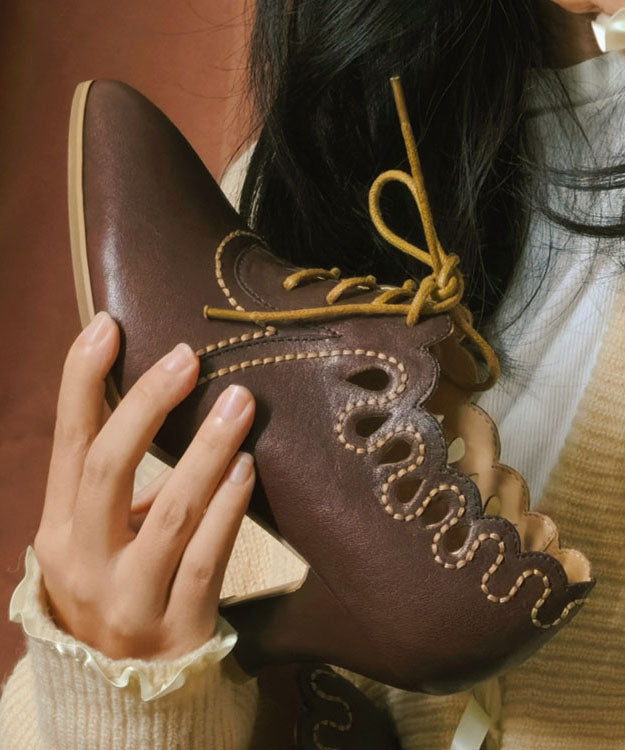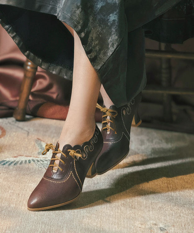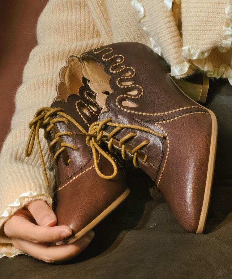 Brown Cowhide Leather High Heels Splicing Hollow Out Lace Up