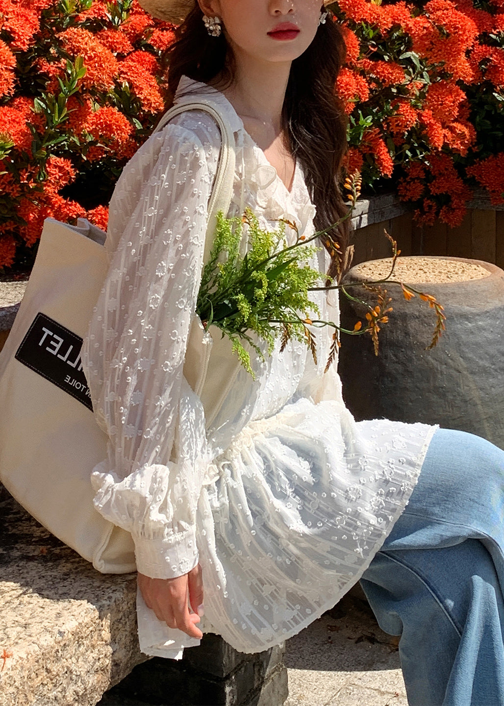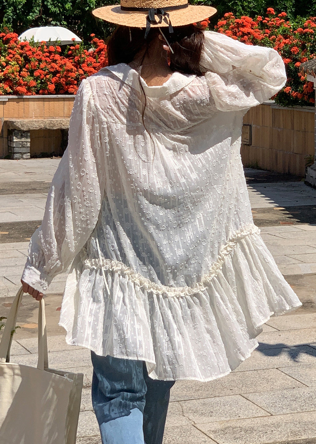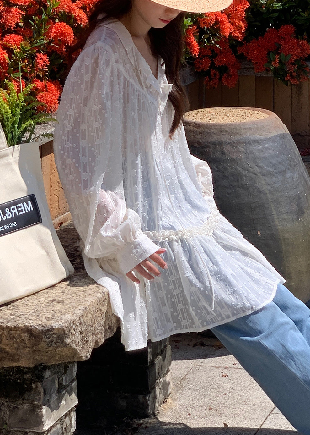 Jacquard White Lace Up Hollow Out Cotton Shirt Flare Sleeve