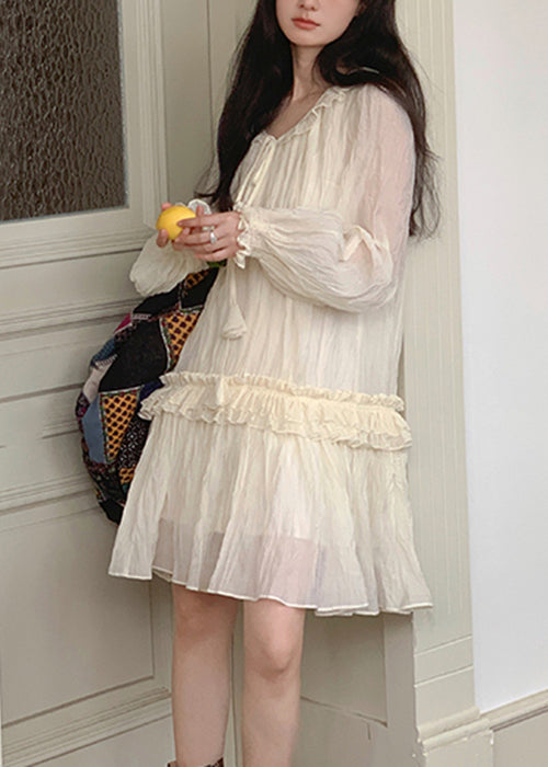 Elegant Apricot Lace Up Ruffled Silk Mini Dresses Fall