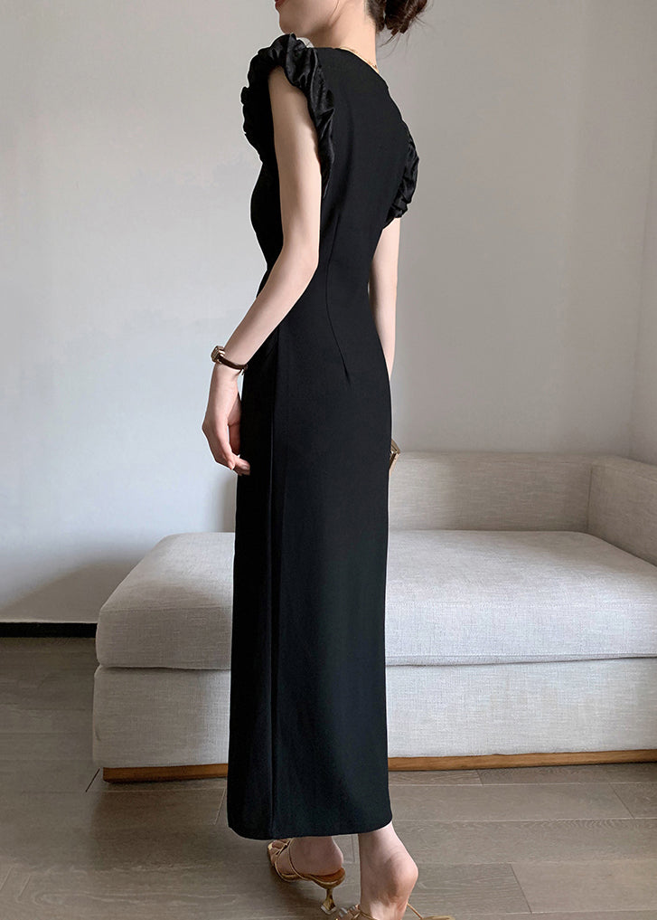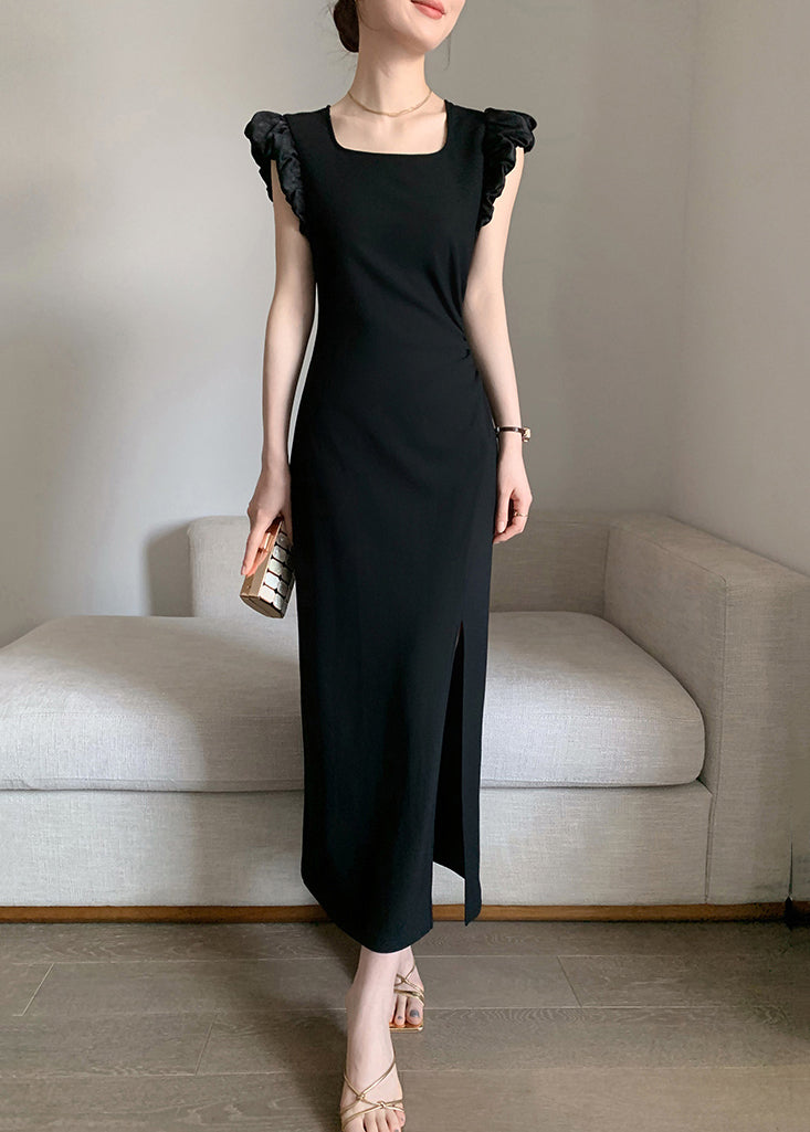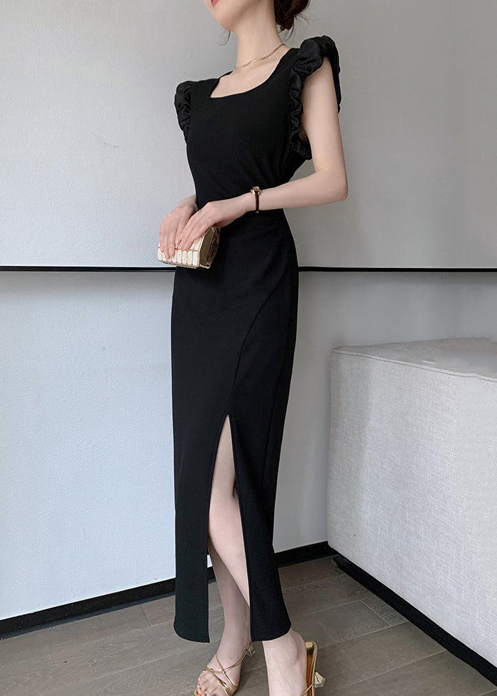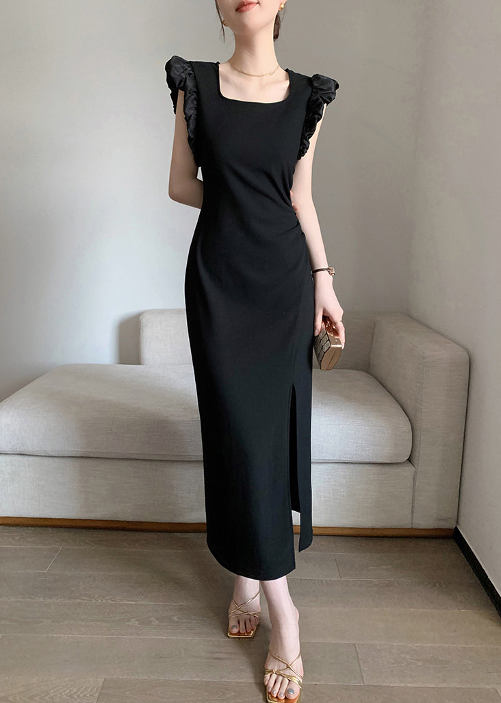 Slim Fit Black Square Collar Side Open Cotton Long Dresses Summer