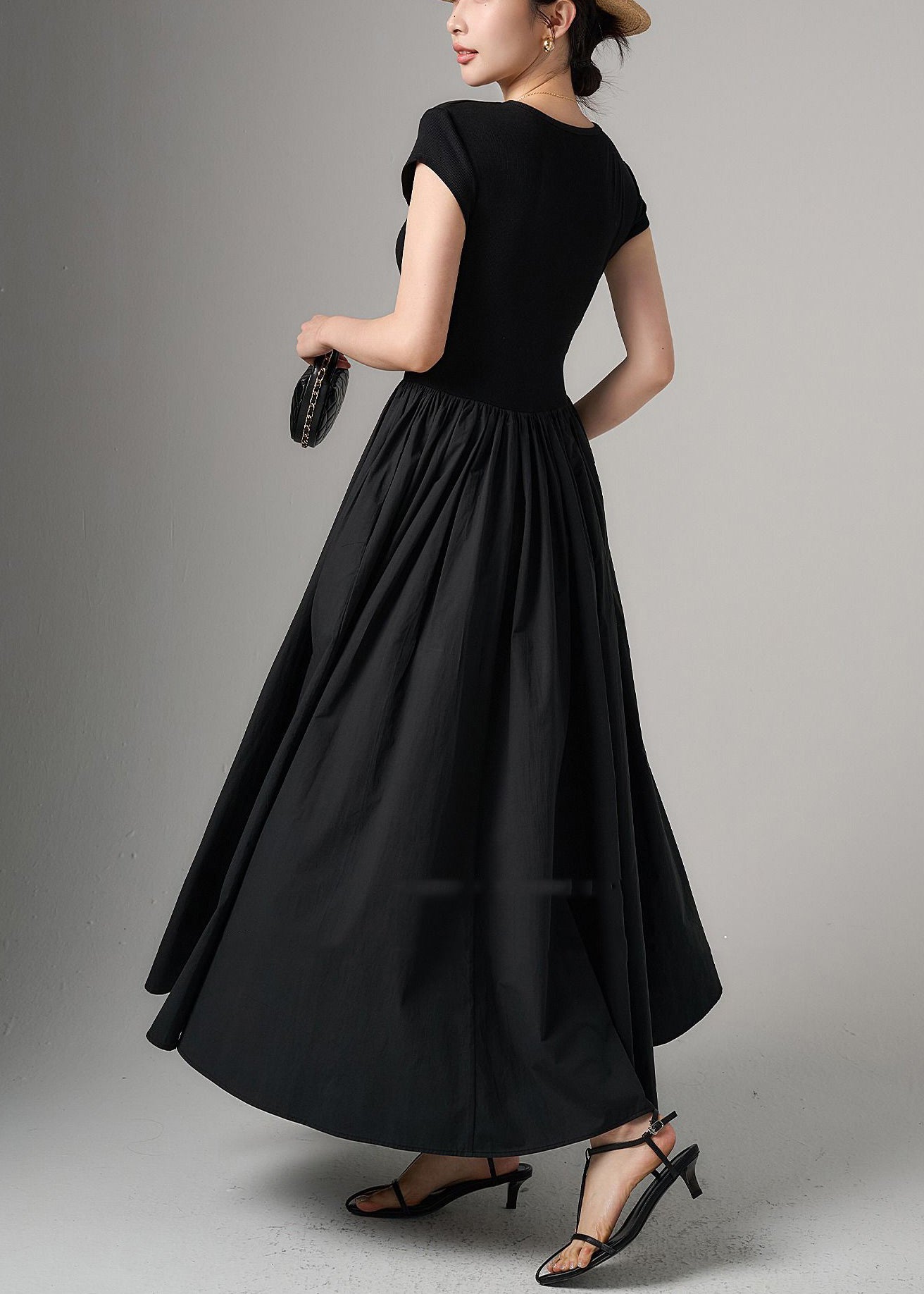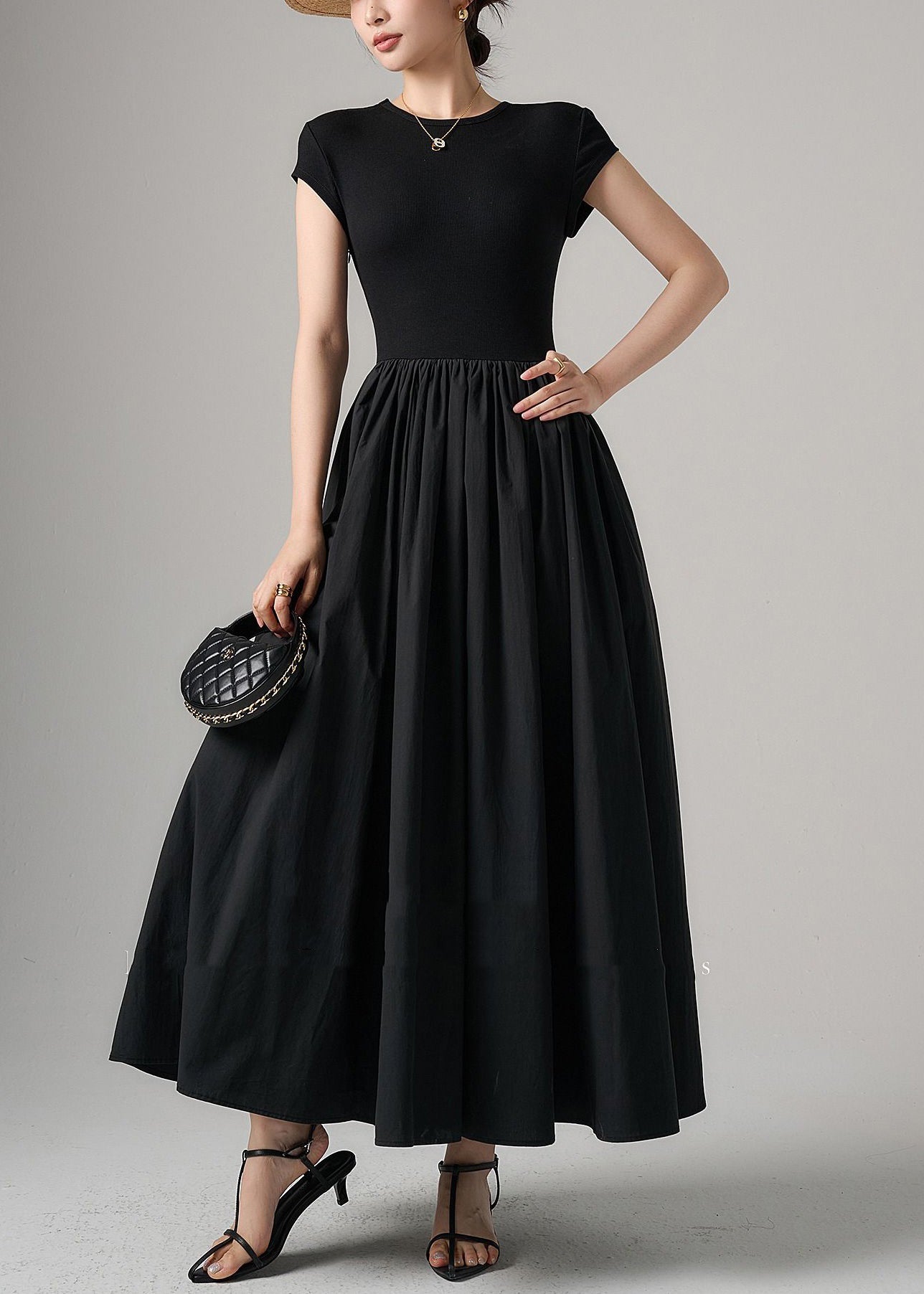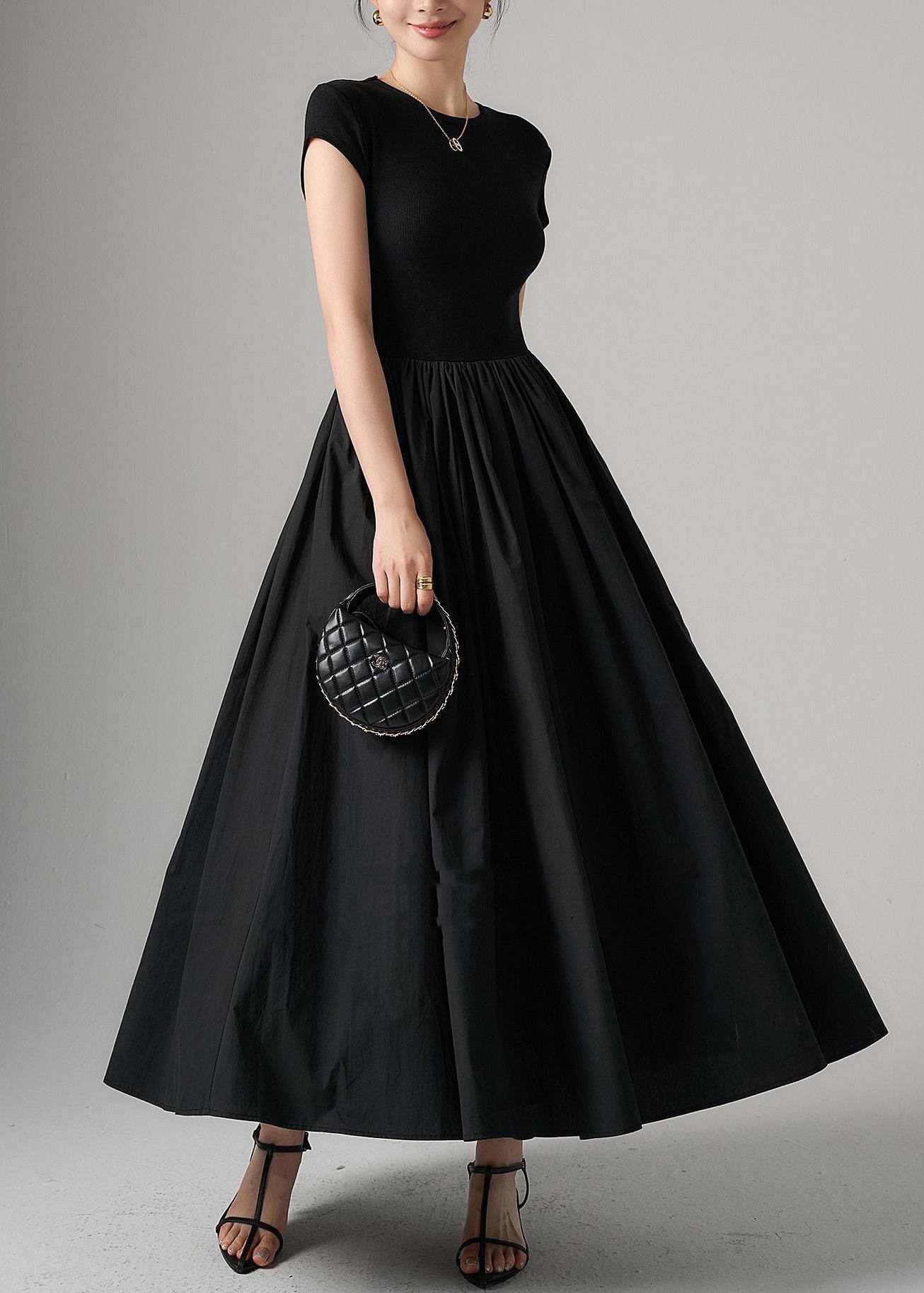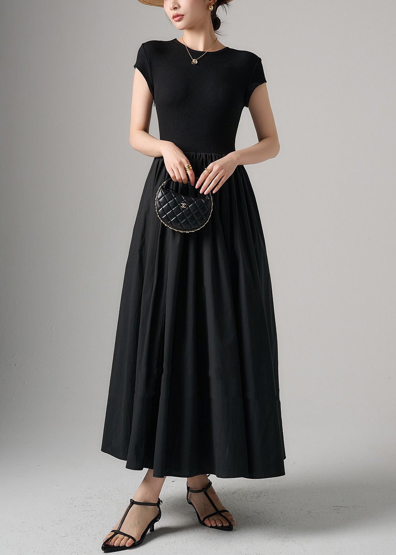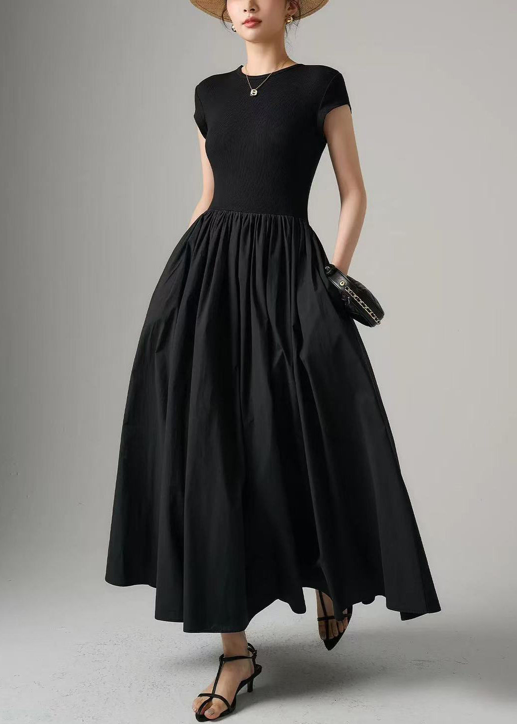 Women Black Pockets Knit Patchwork Cotton Long Dress Summer
