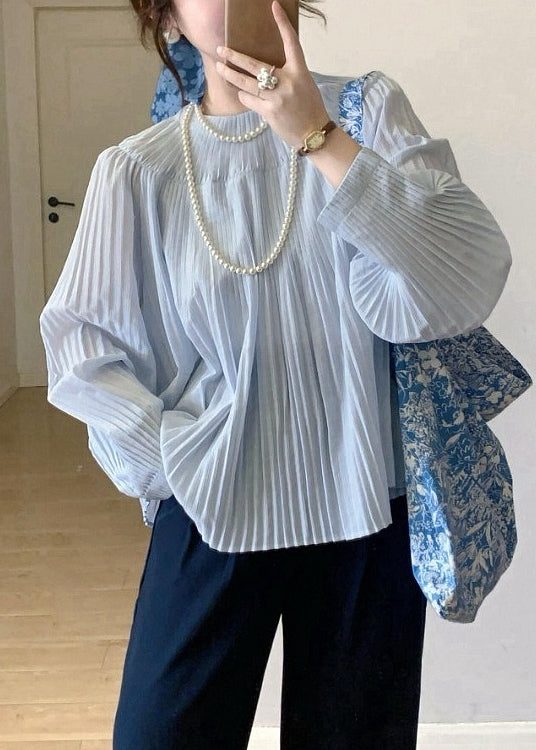 Elegant Light Blue Wrinkled Solid Cotton Shirt Fall