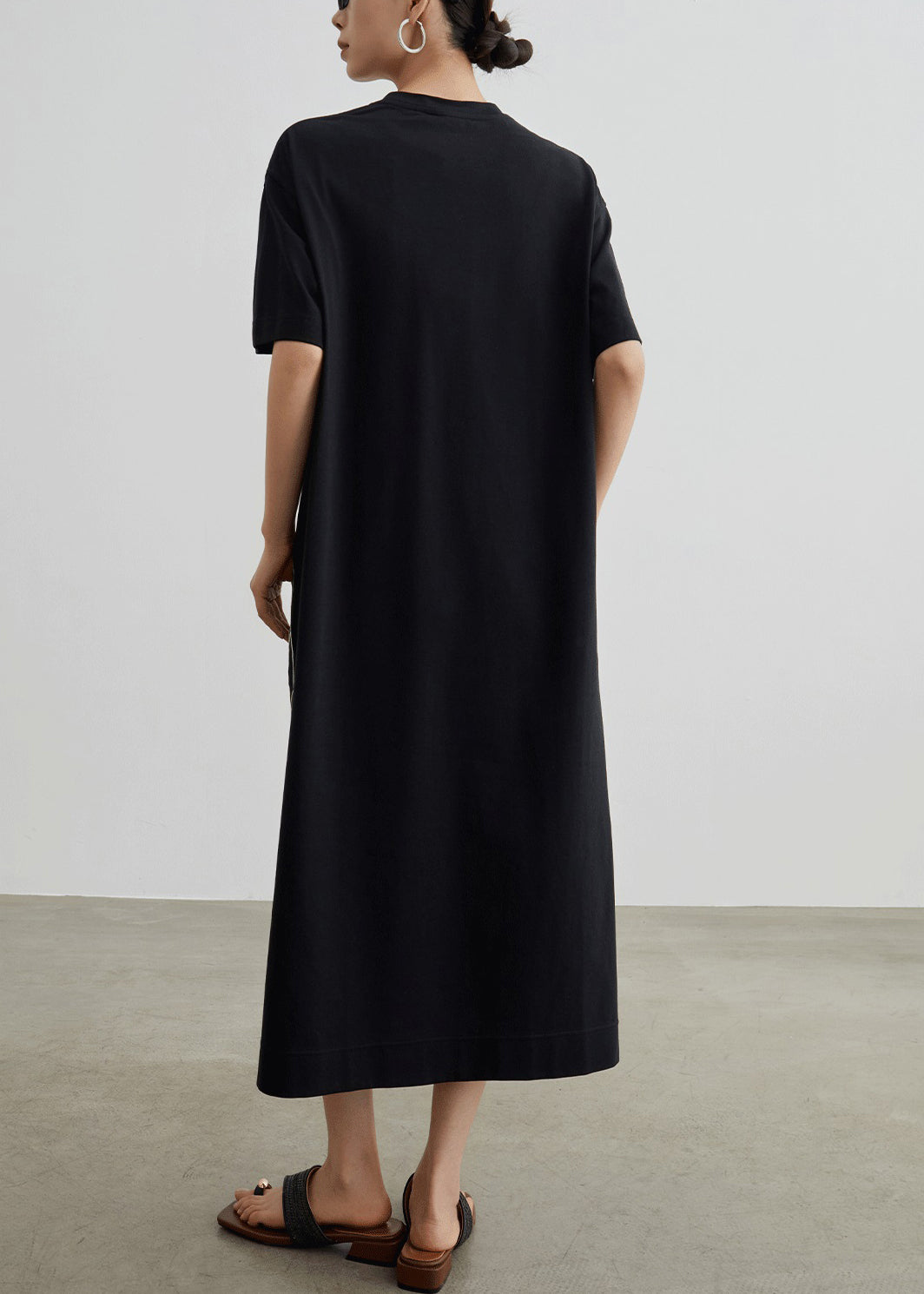 Simple Black O Neck Print Side Open Cotton T Shirt Dresses Summer
