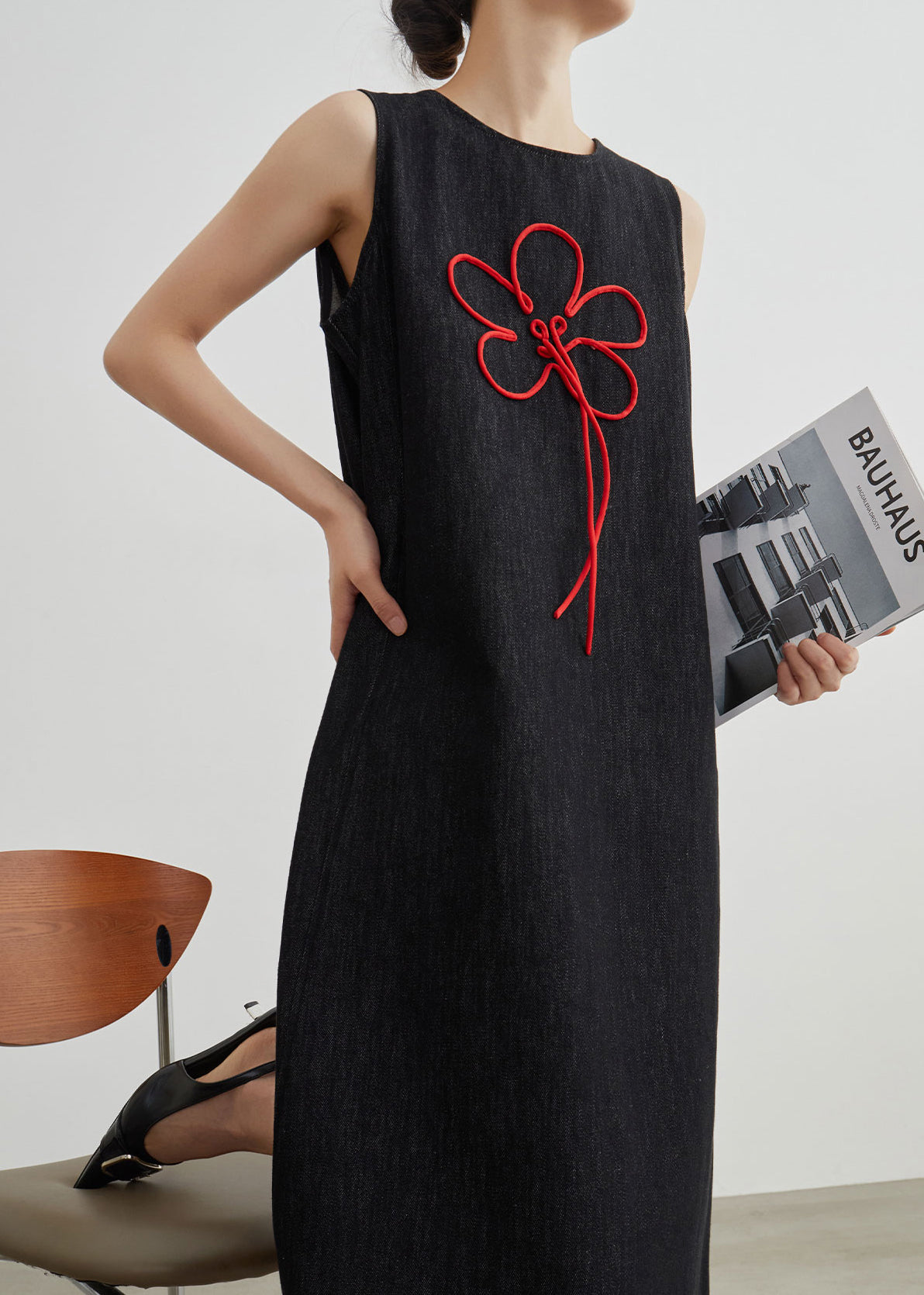 Vintage Black Embroidered Zippered Denim Dresses Sleeveless