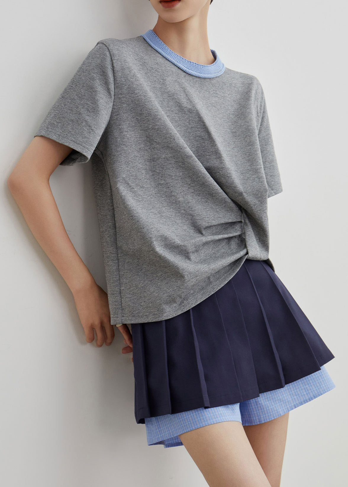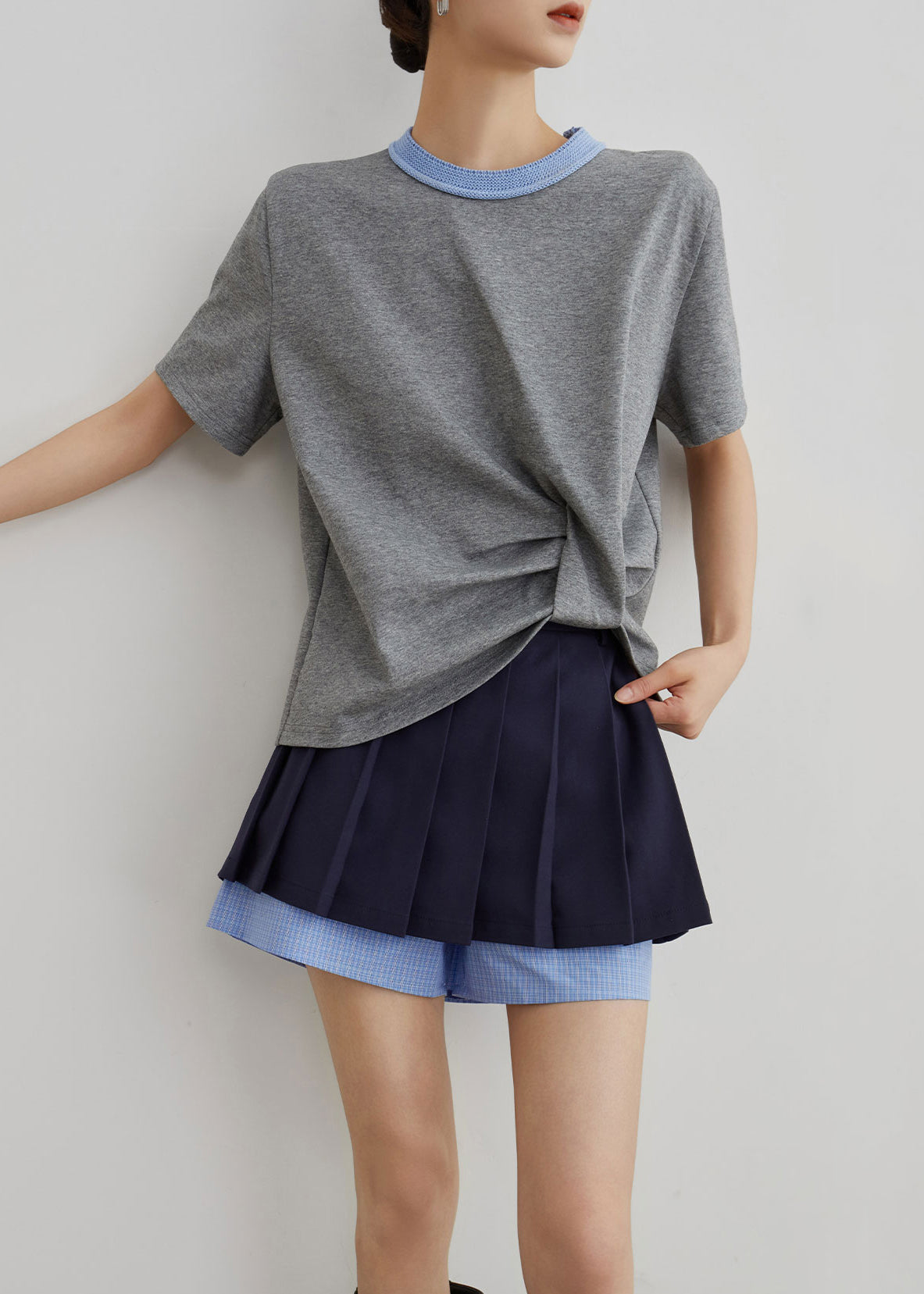 French Grey O-Neck Patchwork T Shirts And Navy Pants Skirt Cotton Two Piece Set Summer