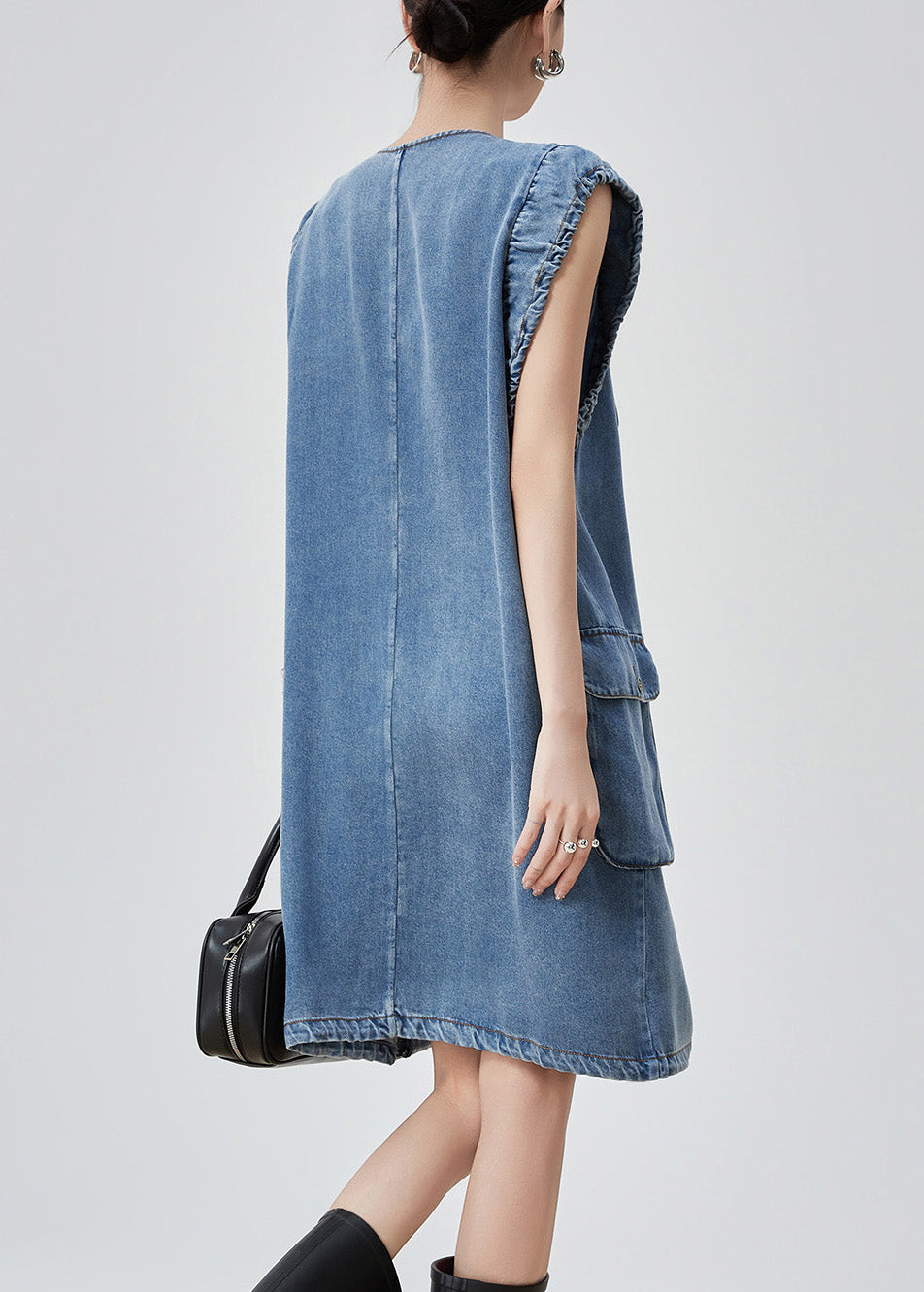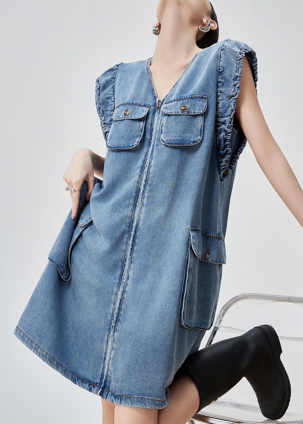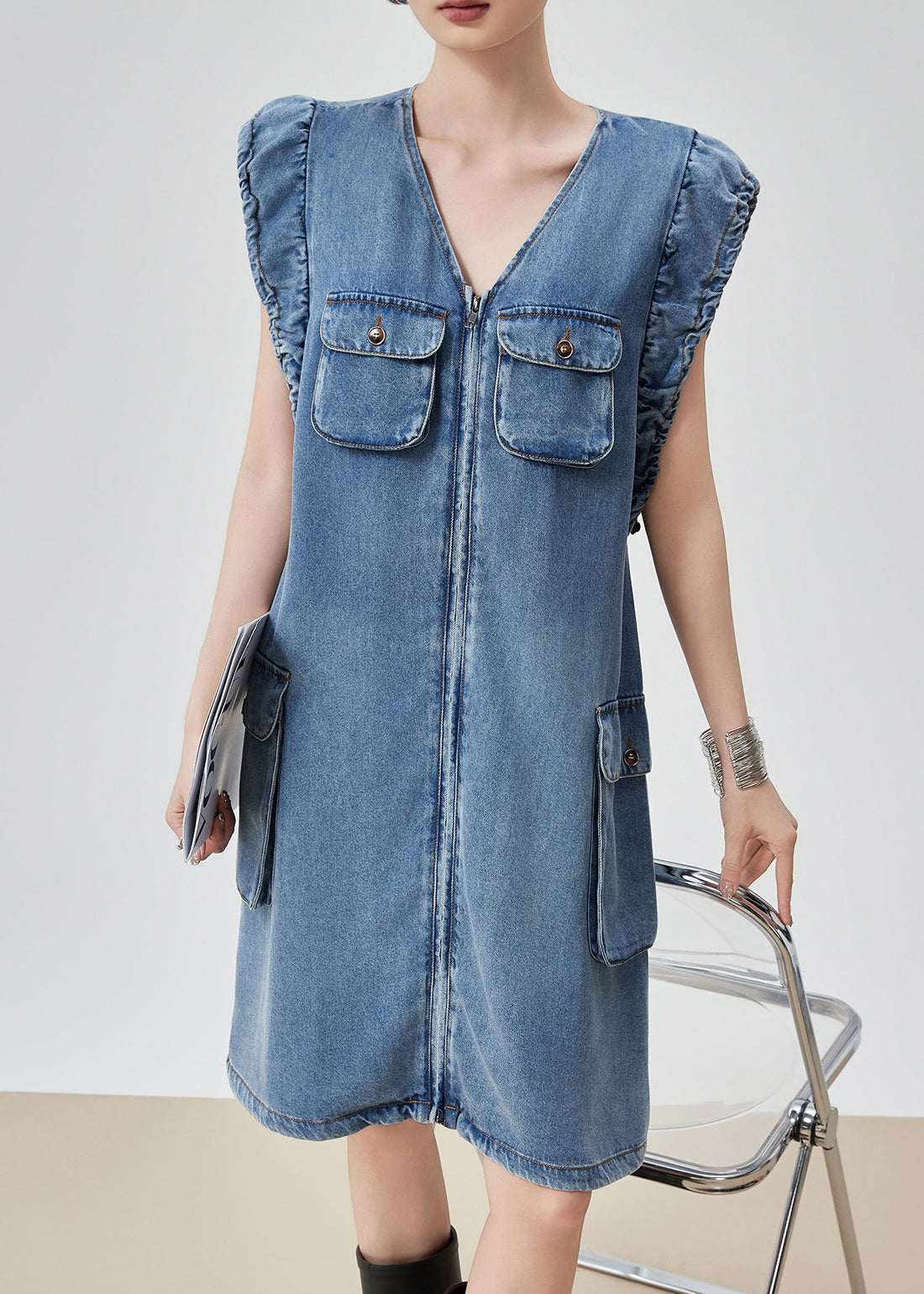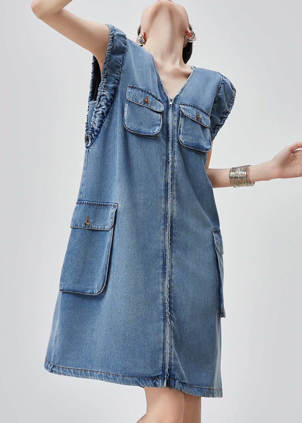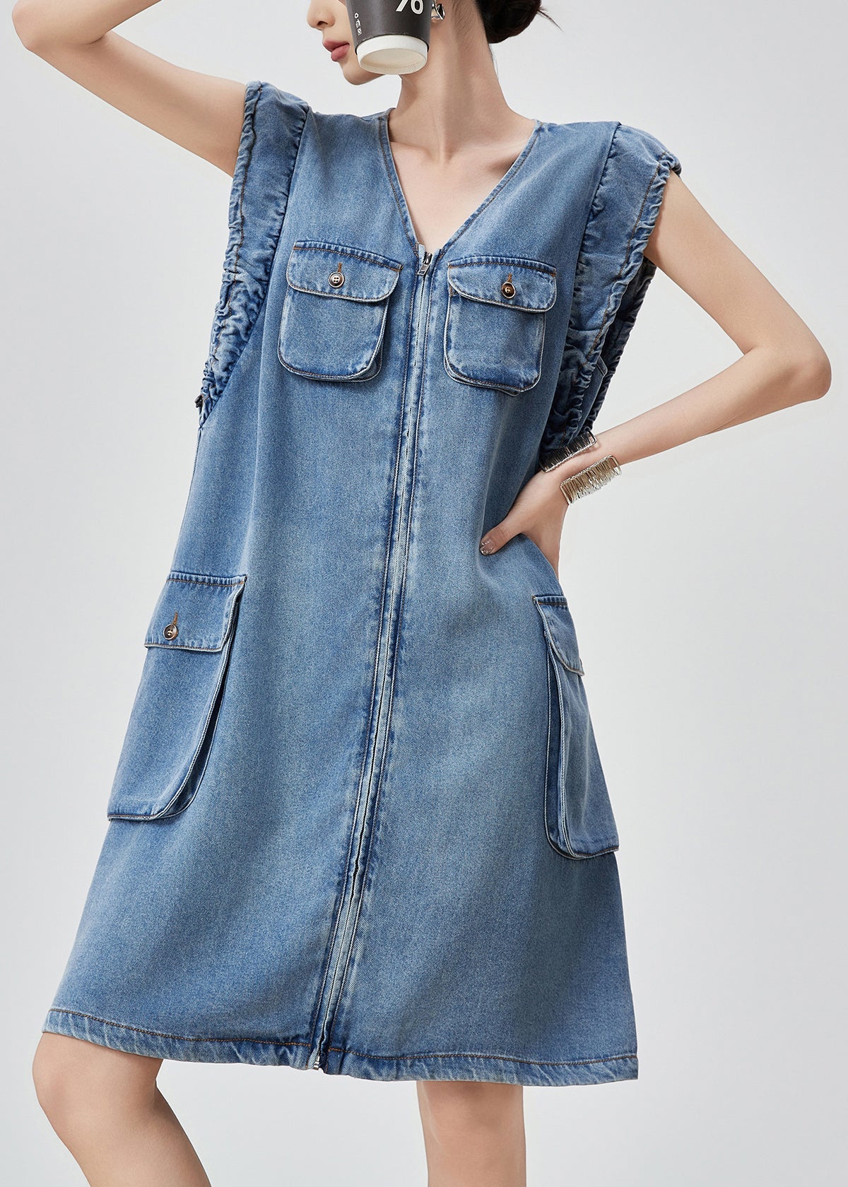 Original Blue V Neck Zippered Pockets Denim Mid Dress Sleeveless