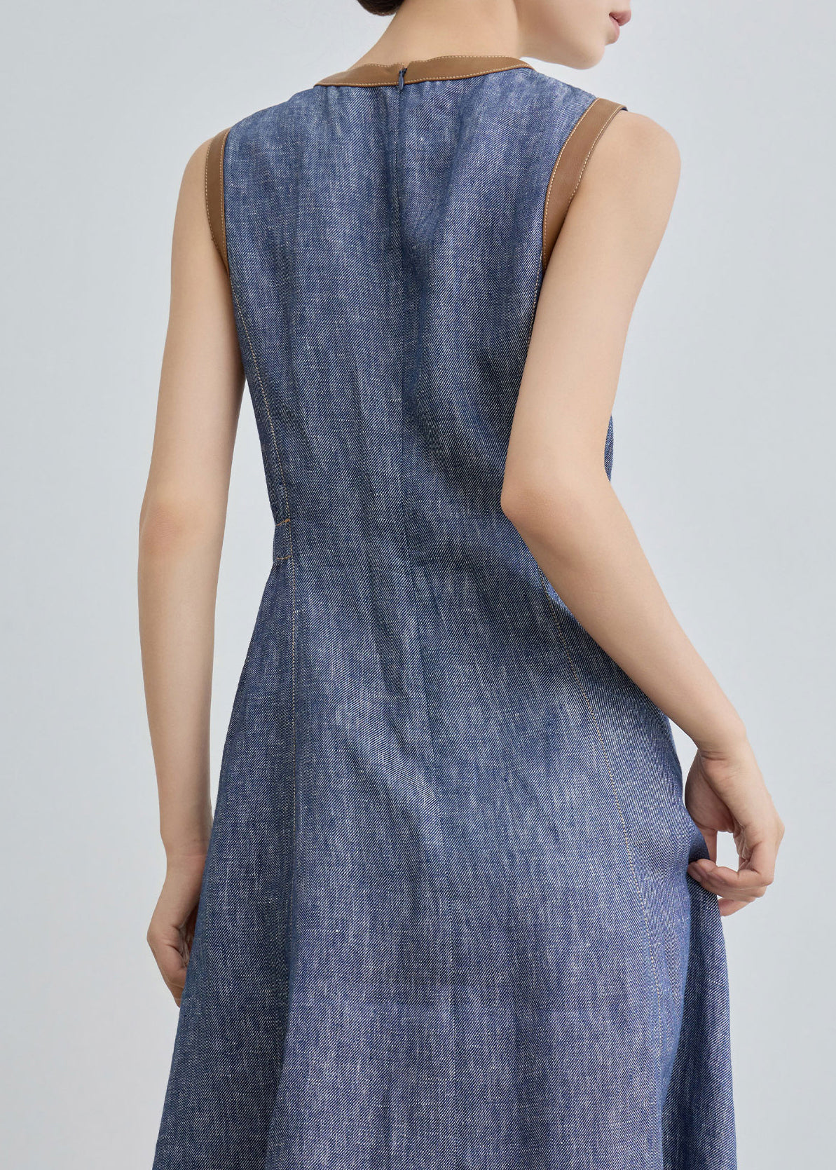 Slim Fit Blue O Neck Pockets Patchwork Denim Long Dress Sleeveless
