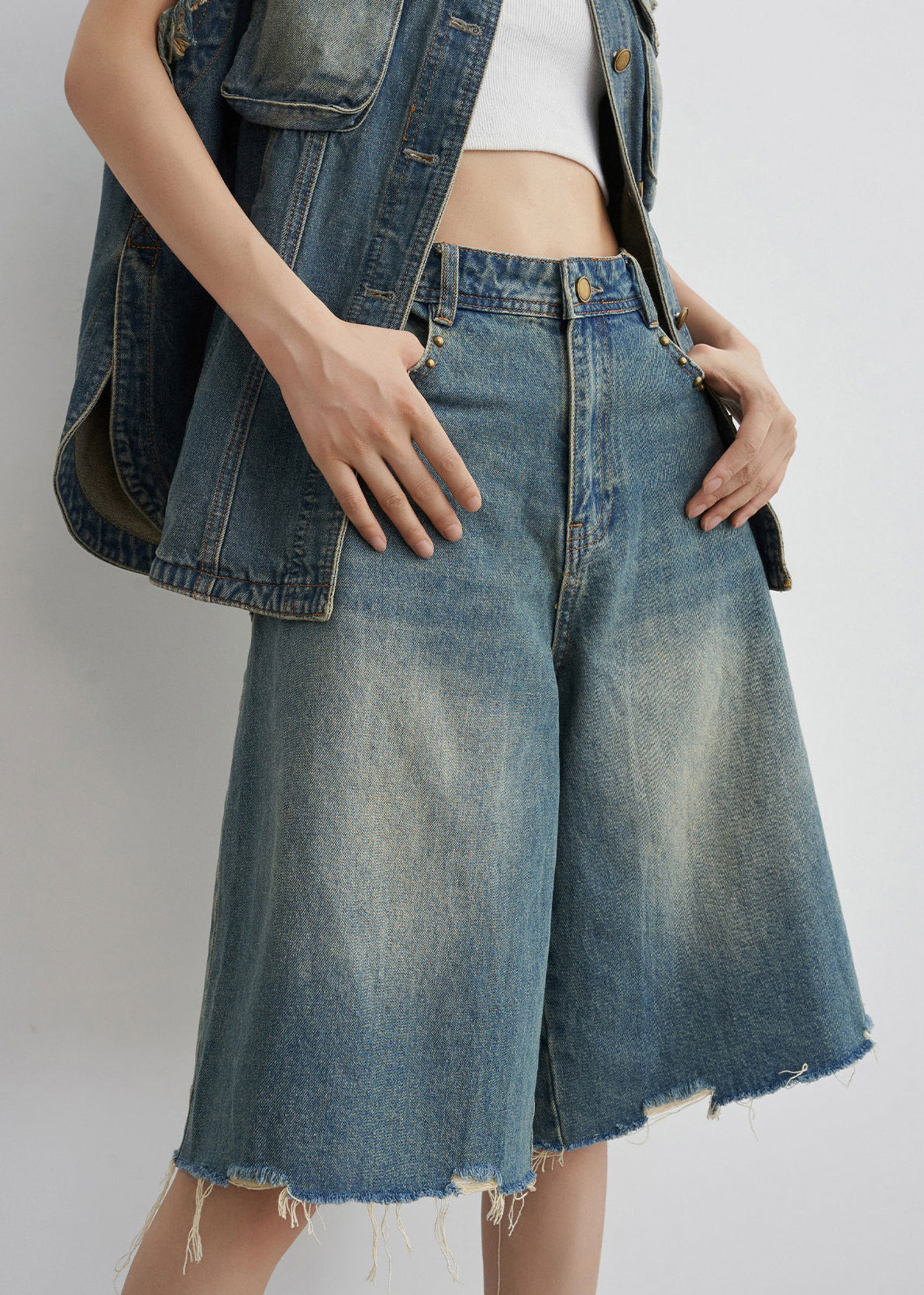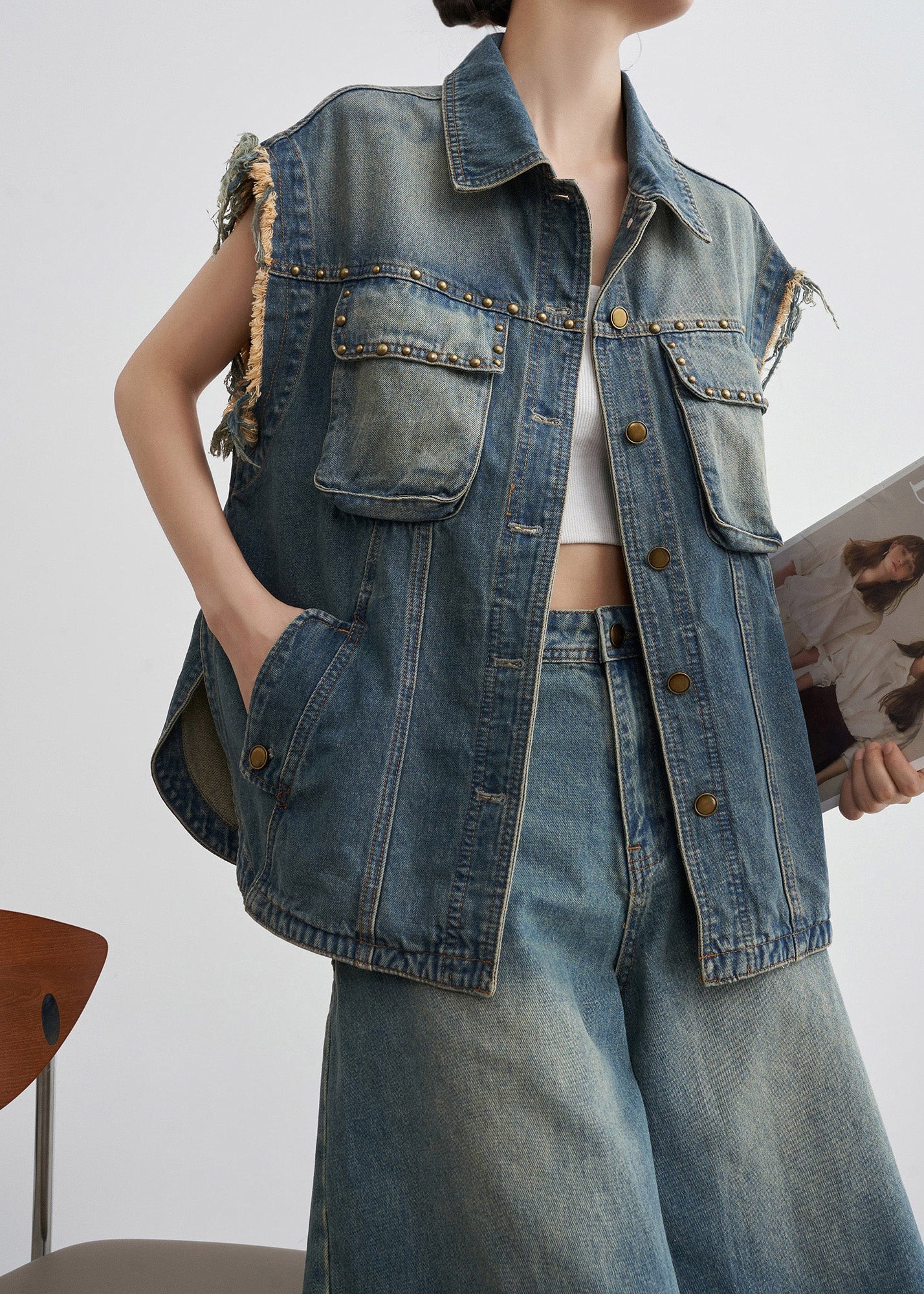 Vintage Blue Nail Bead Button Denim Two-Piece Set Summer