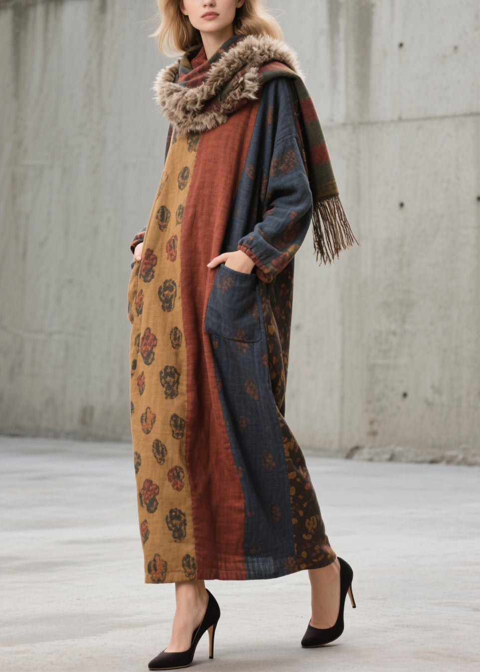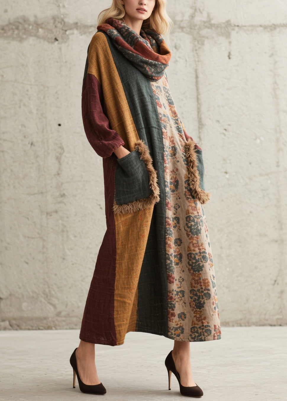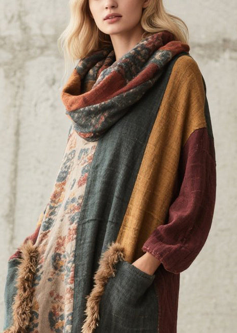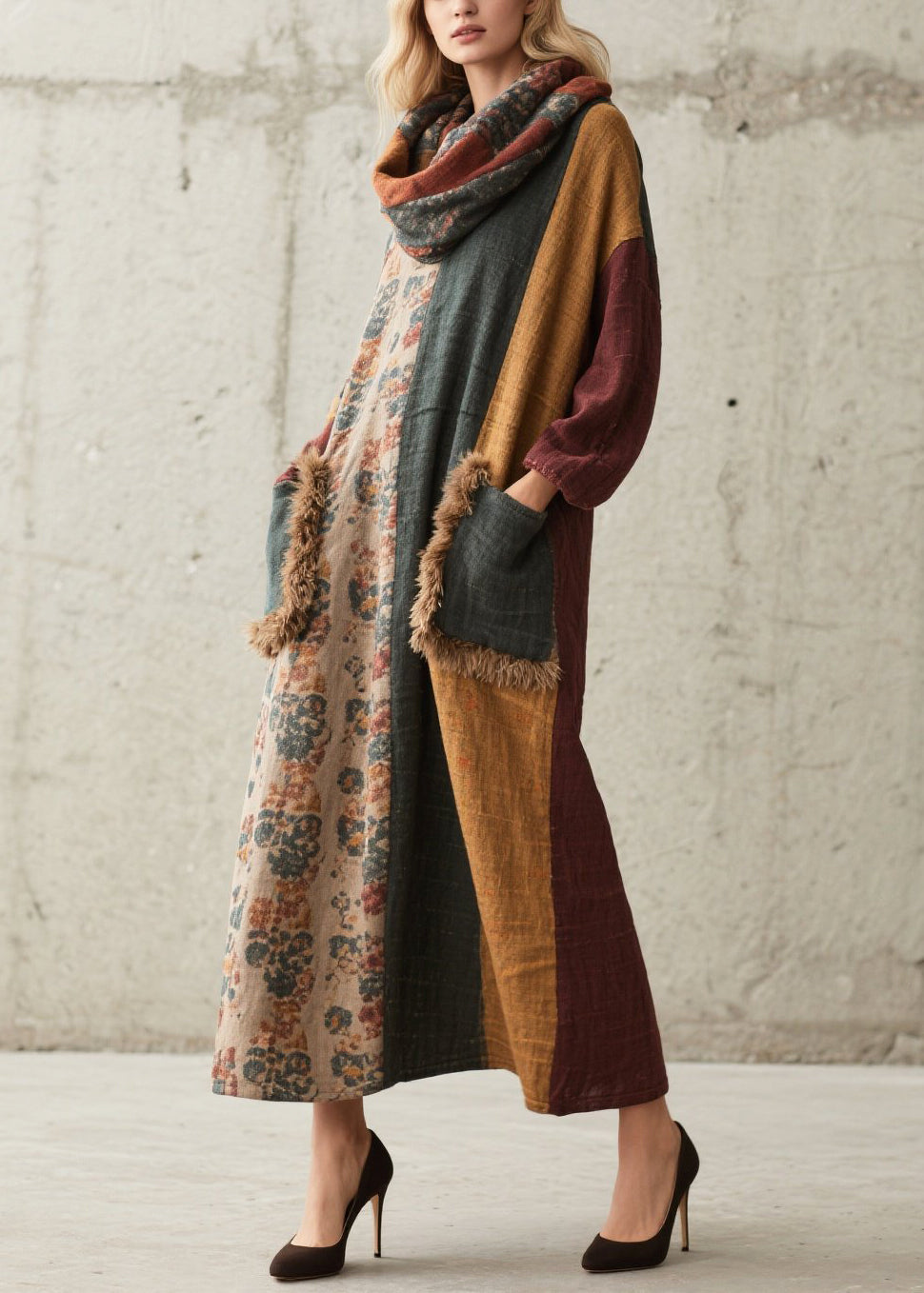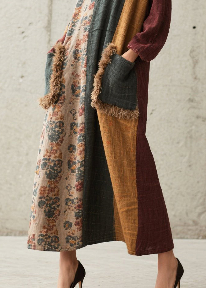 Art Colorblock Oversized Patchwork Faux Fur With Pockets Vacation Dress Fall