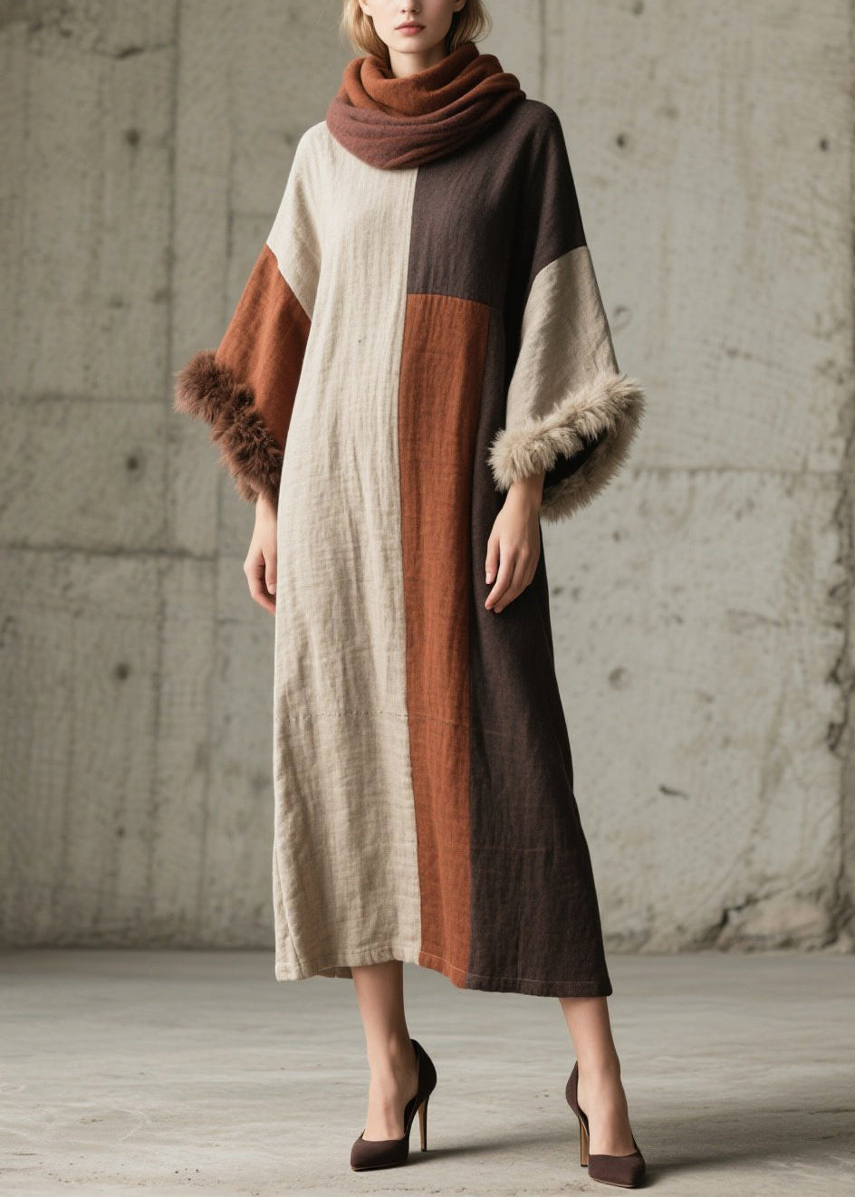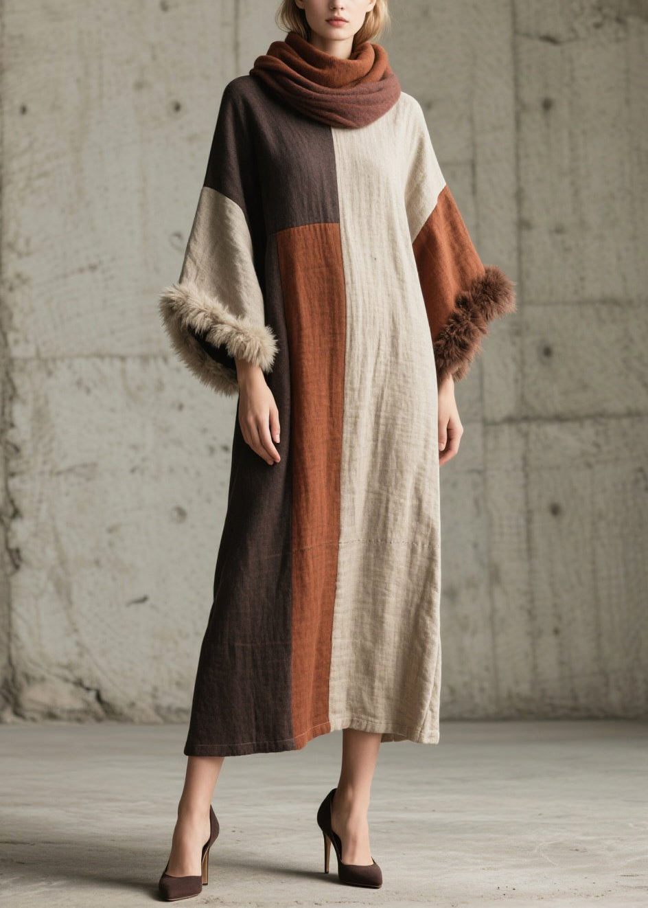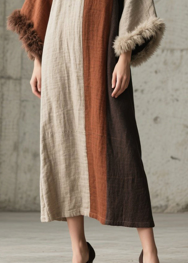 Casual Colorblock Oversized Patchwork Faux Fur Maxi Dresses Bracelet Sleeve