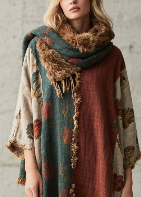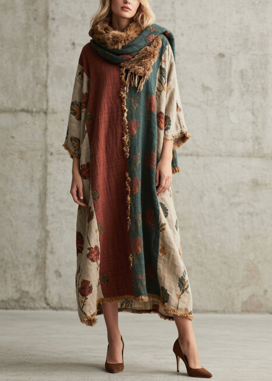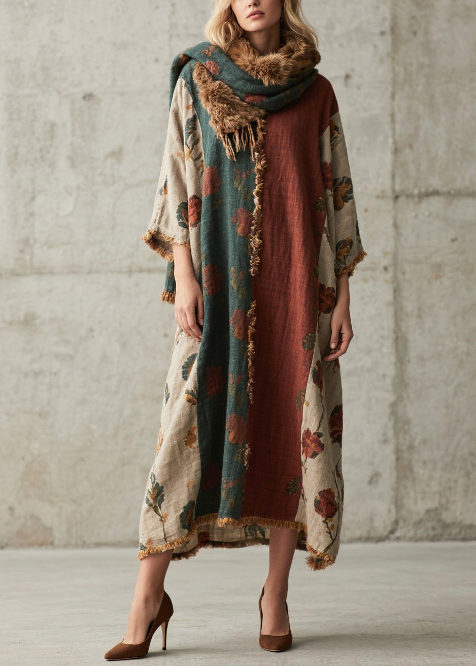 Boho Mixed Color Oversized Patchwork Faux Fur Ankle Dress Flare Sleeve