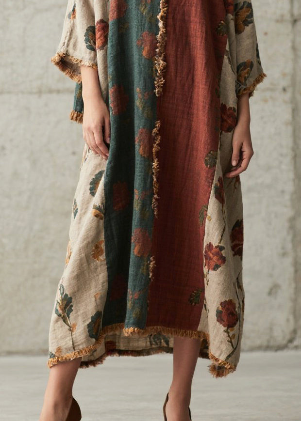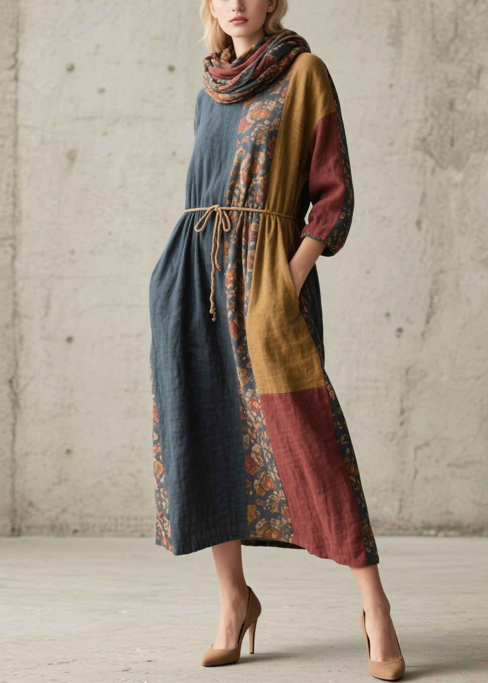 Italian Colorblock Tie Waist Print Cotton Maxi Dresses Fall
