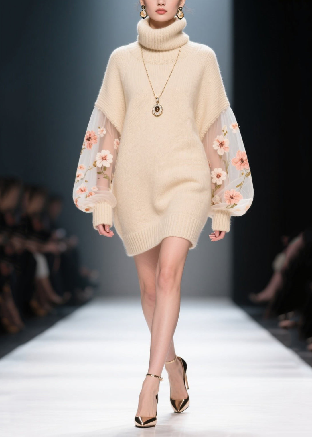 Fine Apricot Turtle Neck Patchwork Tulle Knit Mini Dress Winter