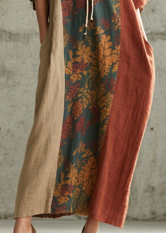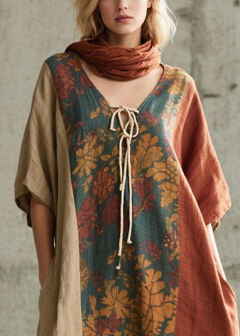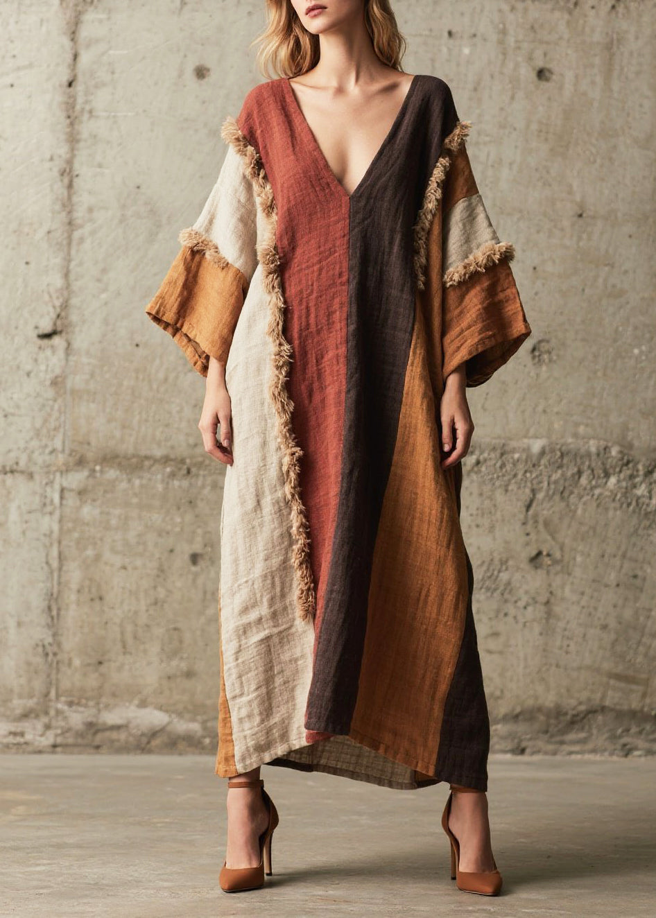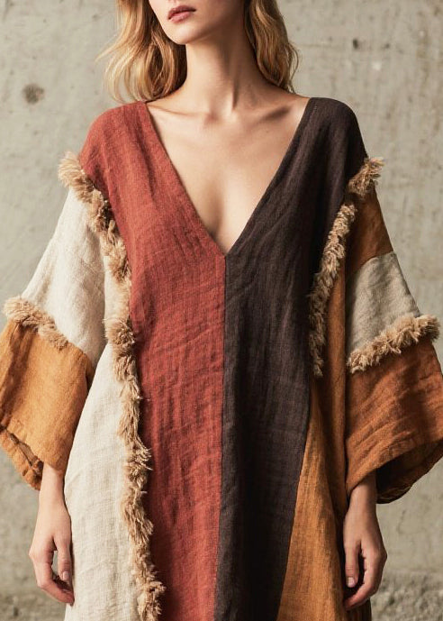 Women Colorblock V Neck Patchwork Cotton Long Dress Summer