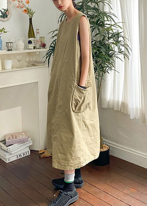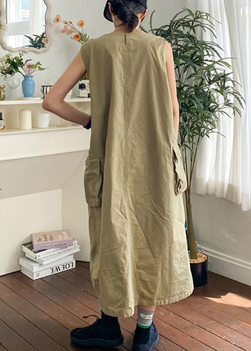 New Khaki O Neck Pockets Cotton Long Dress Sleeveless