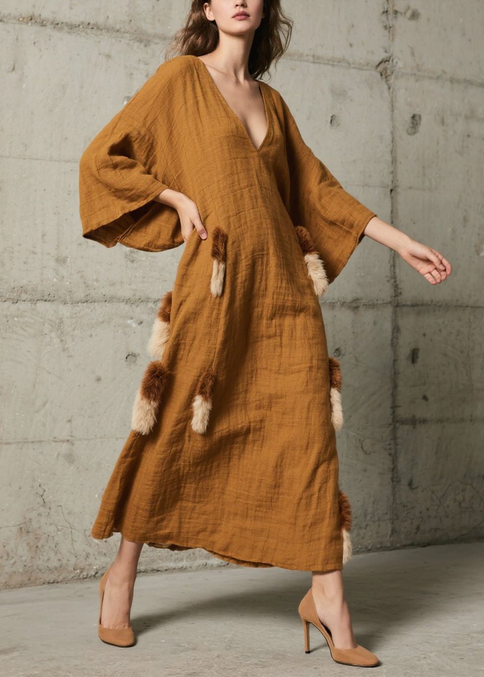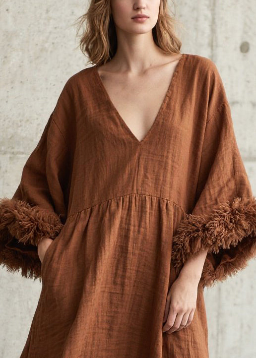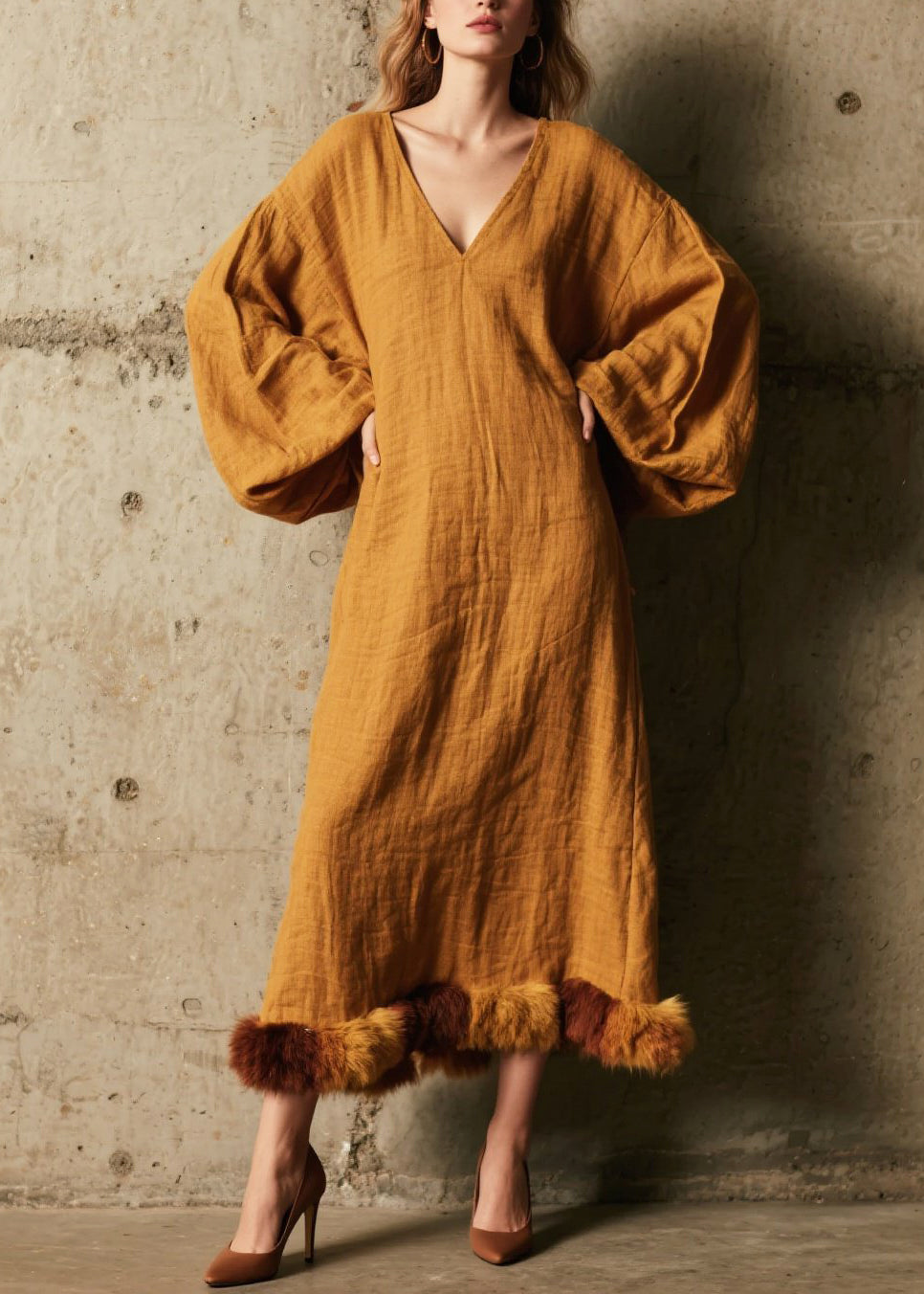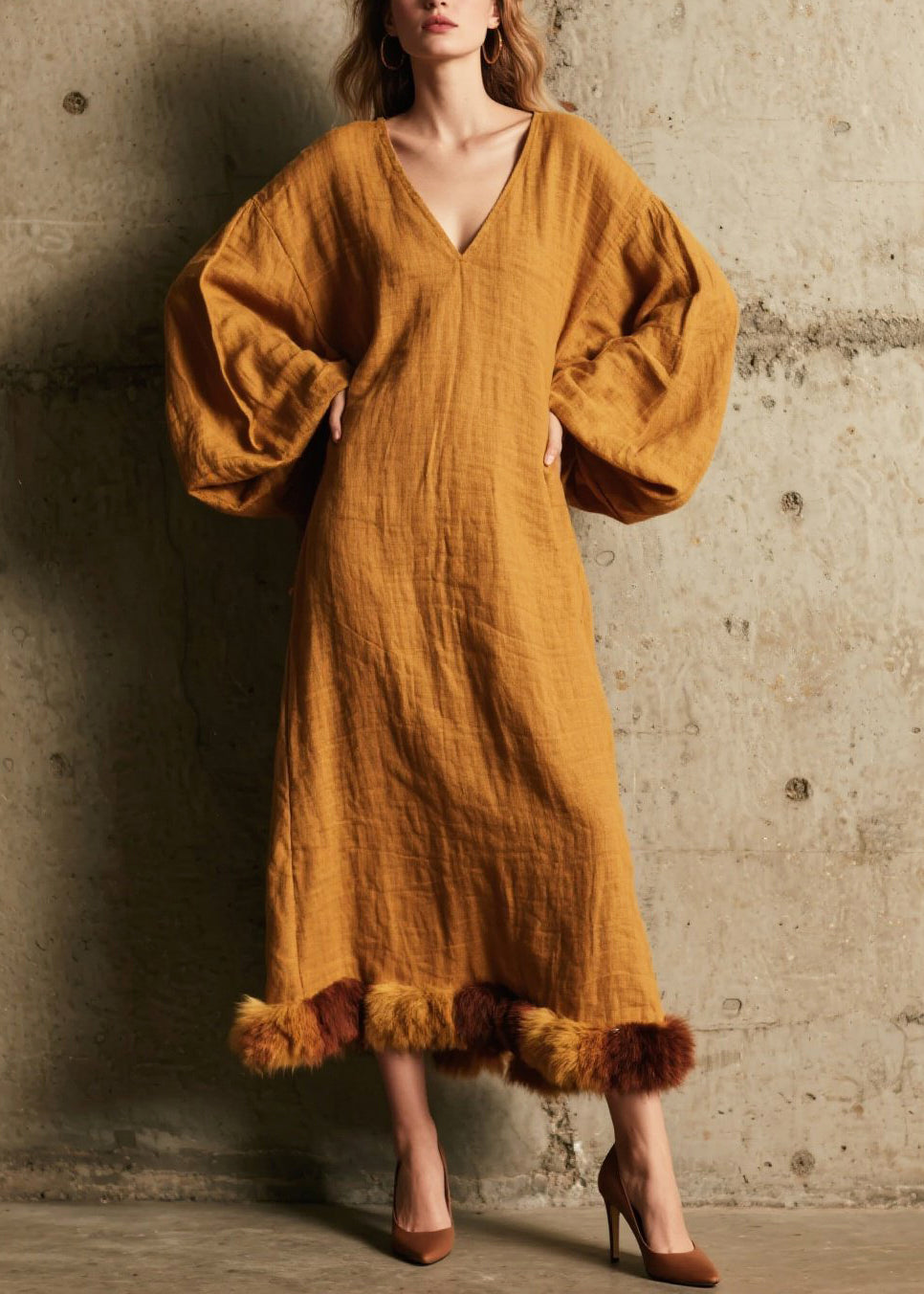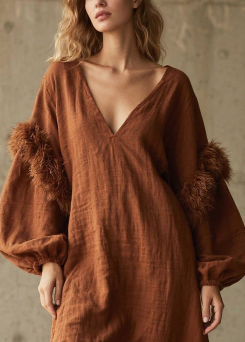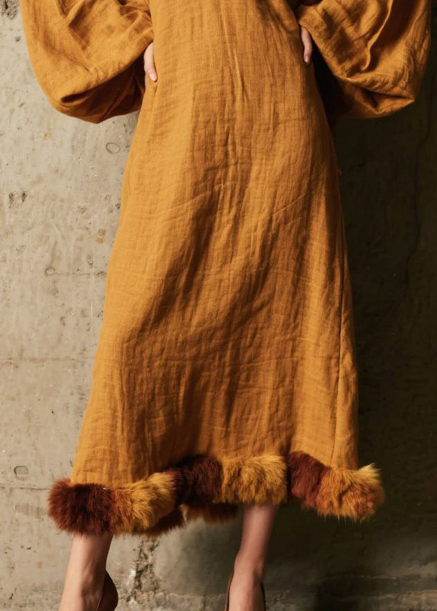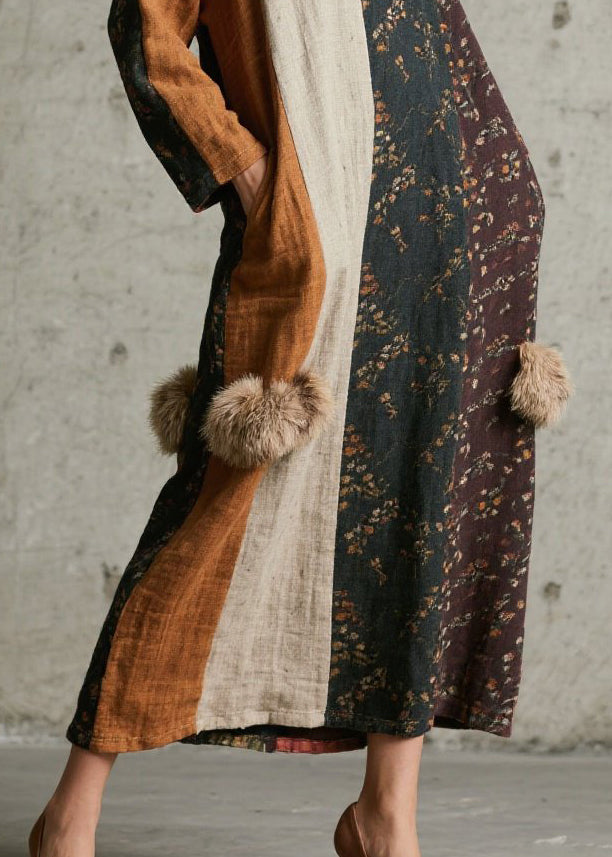 Caramel Patchwork Faux Fur Cotton Long Dress V Neck Fall