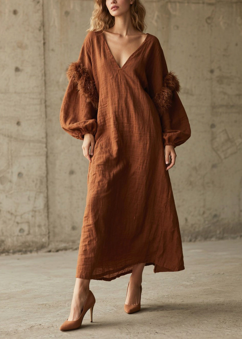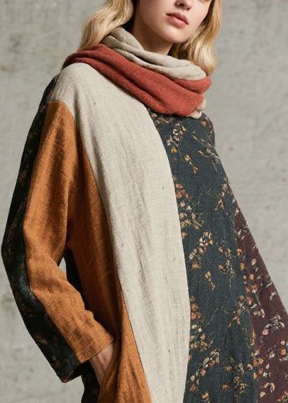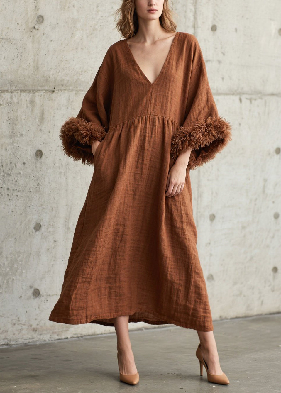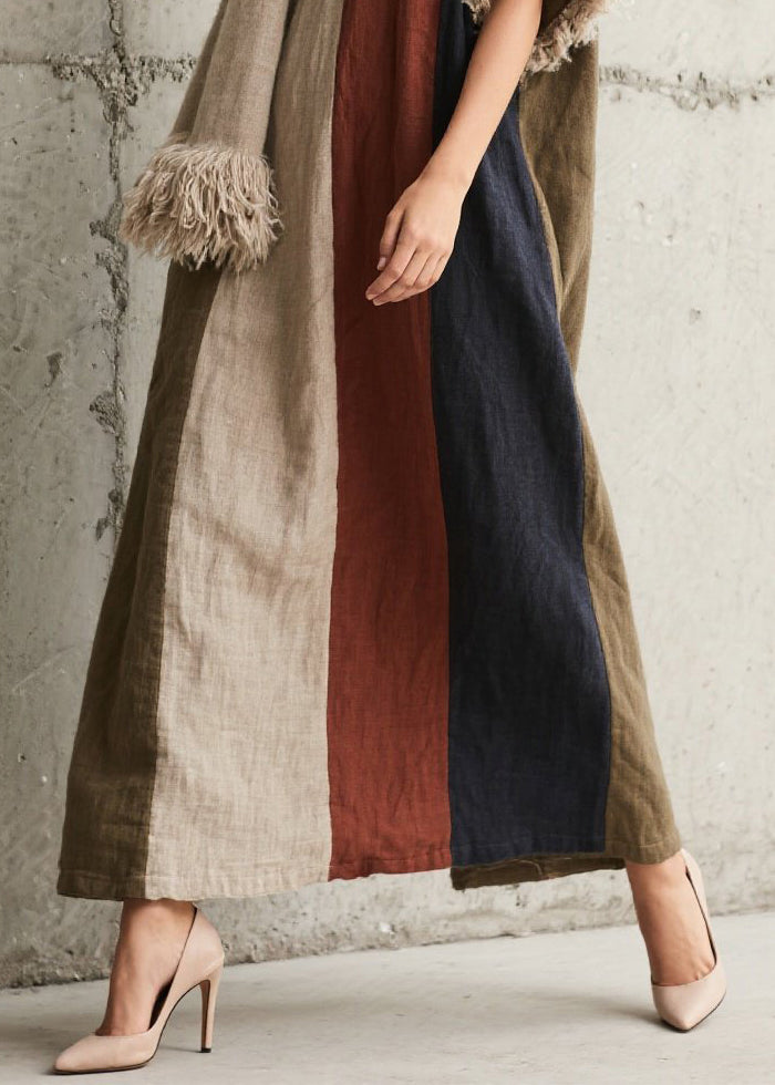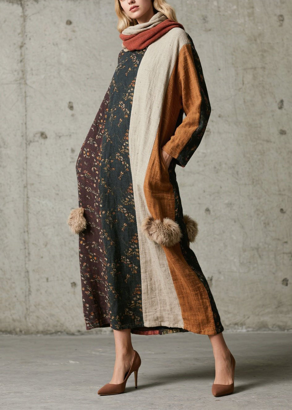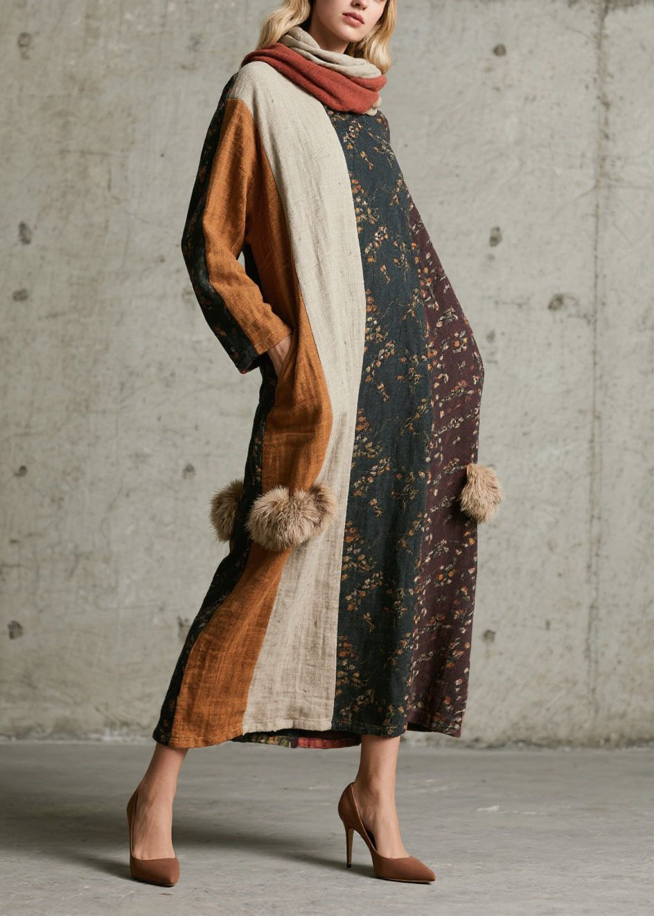 Caramel Patchwork Faux Fur Cotton Long Dress V Neck Fall