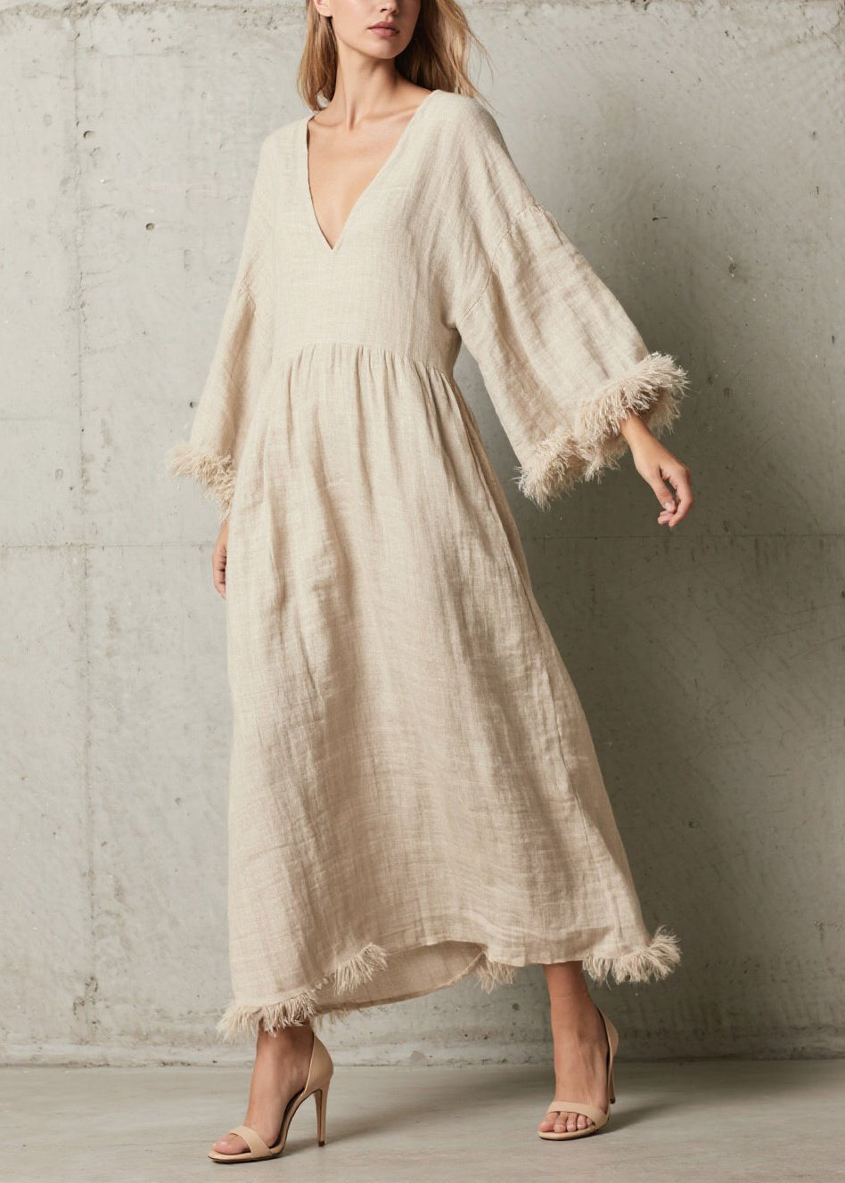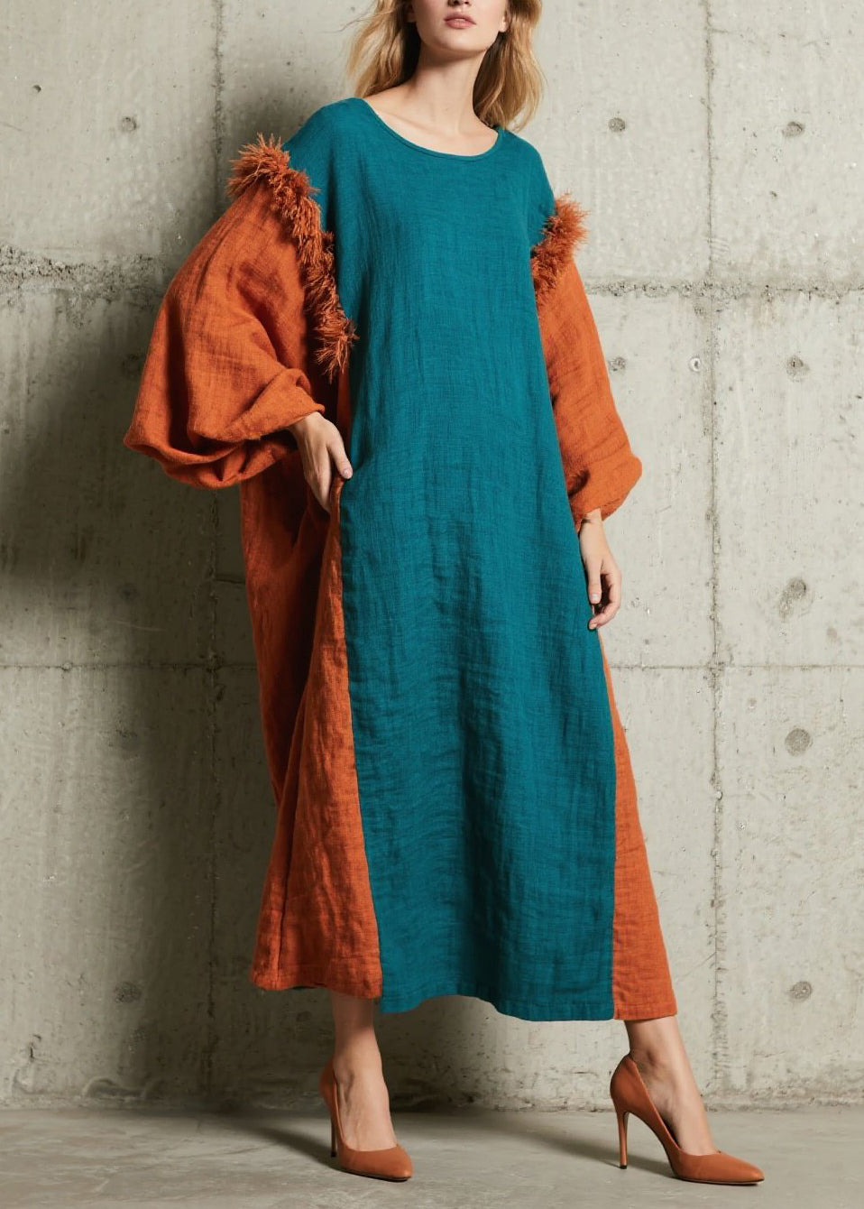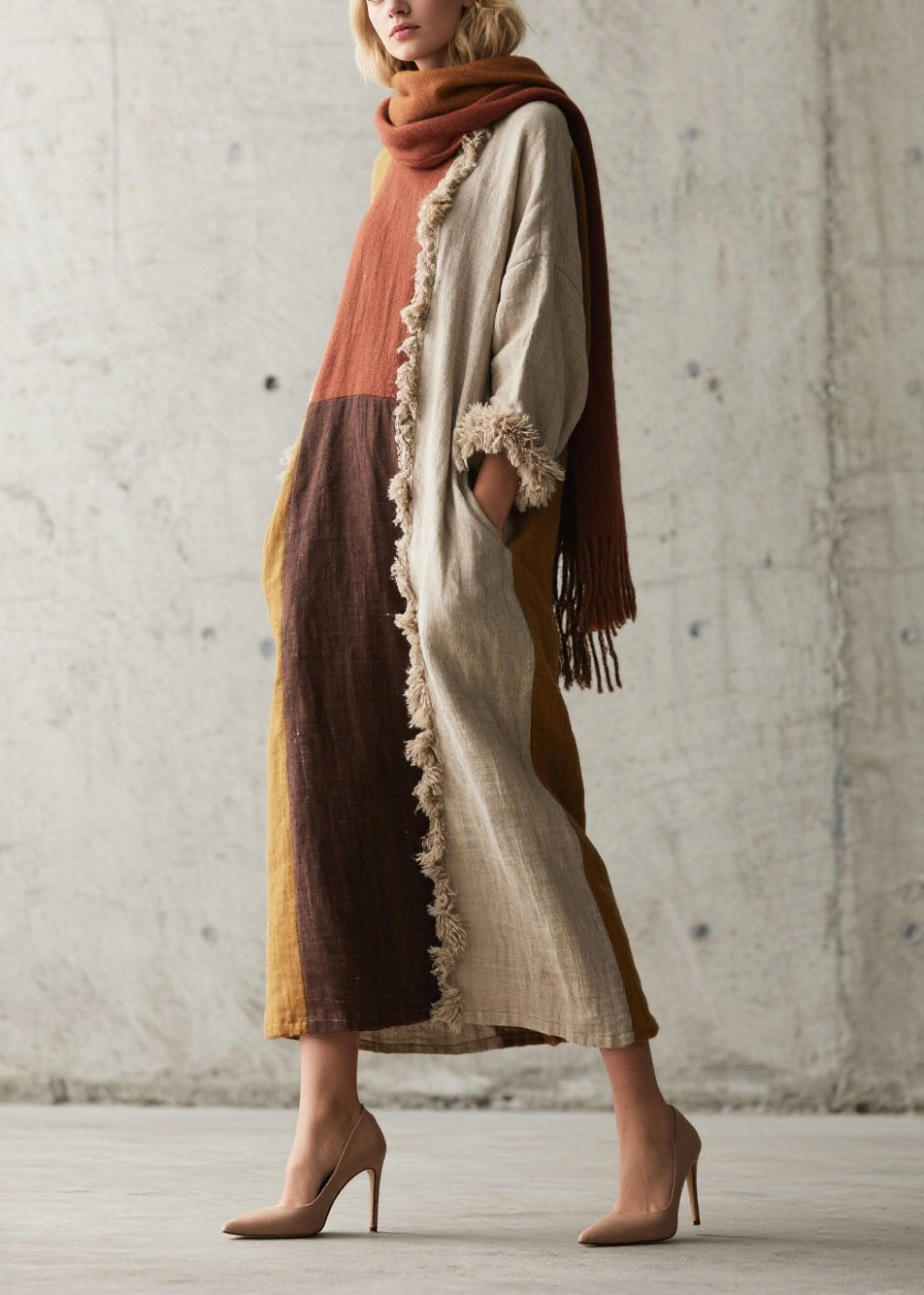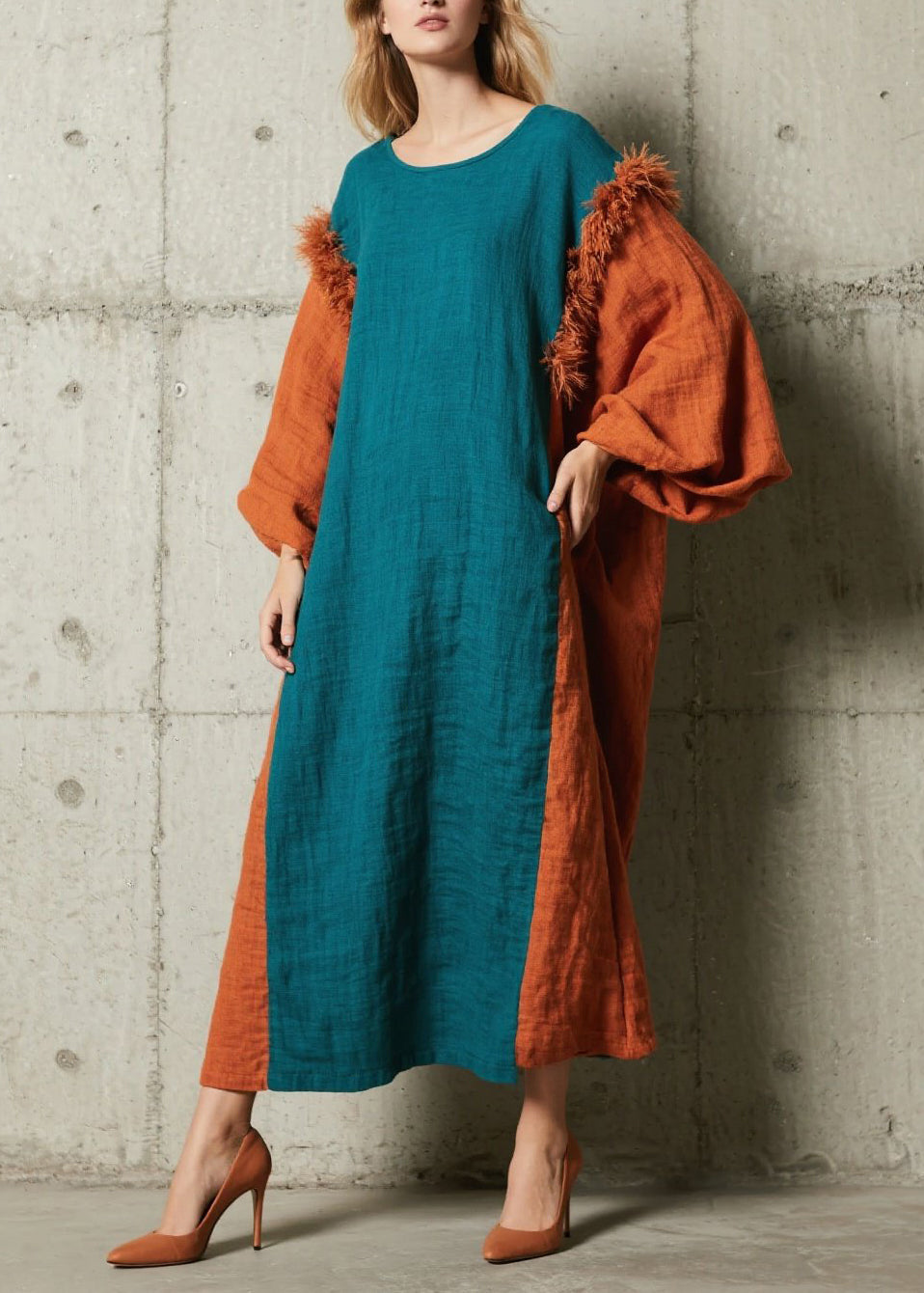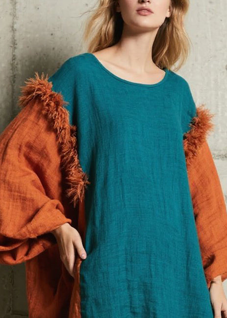 Caramel Patchwork Faux Fur Cotton Long Dress V Neck Fall