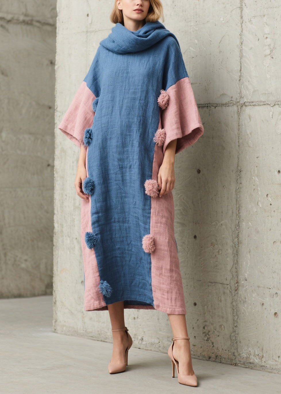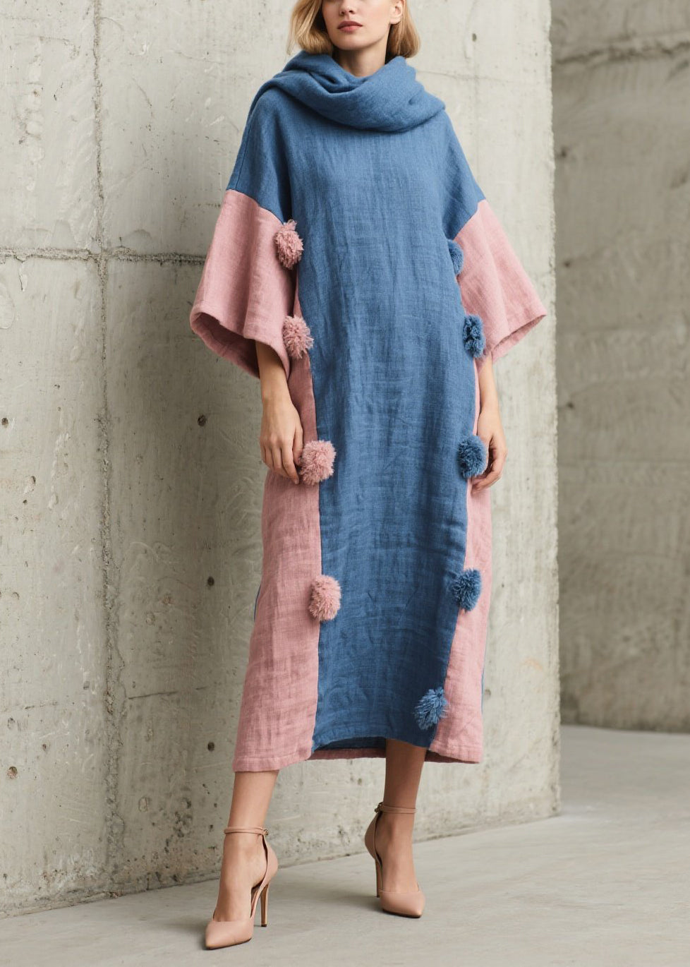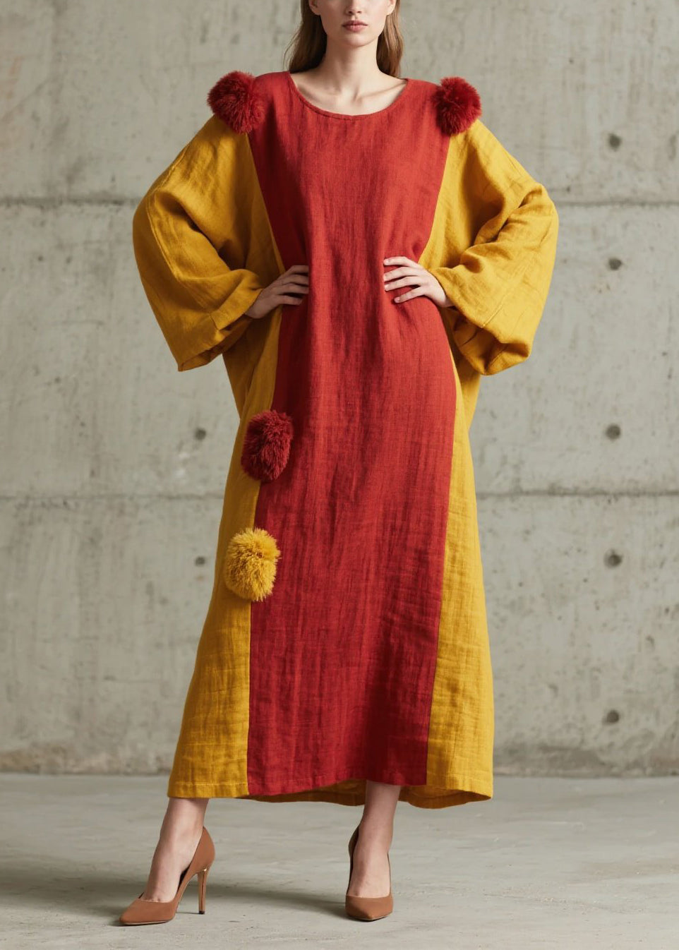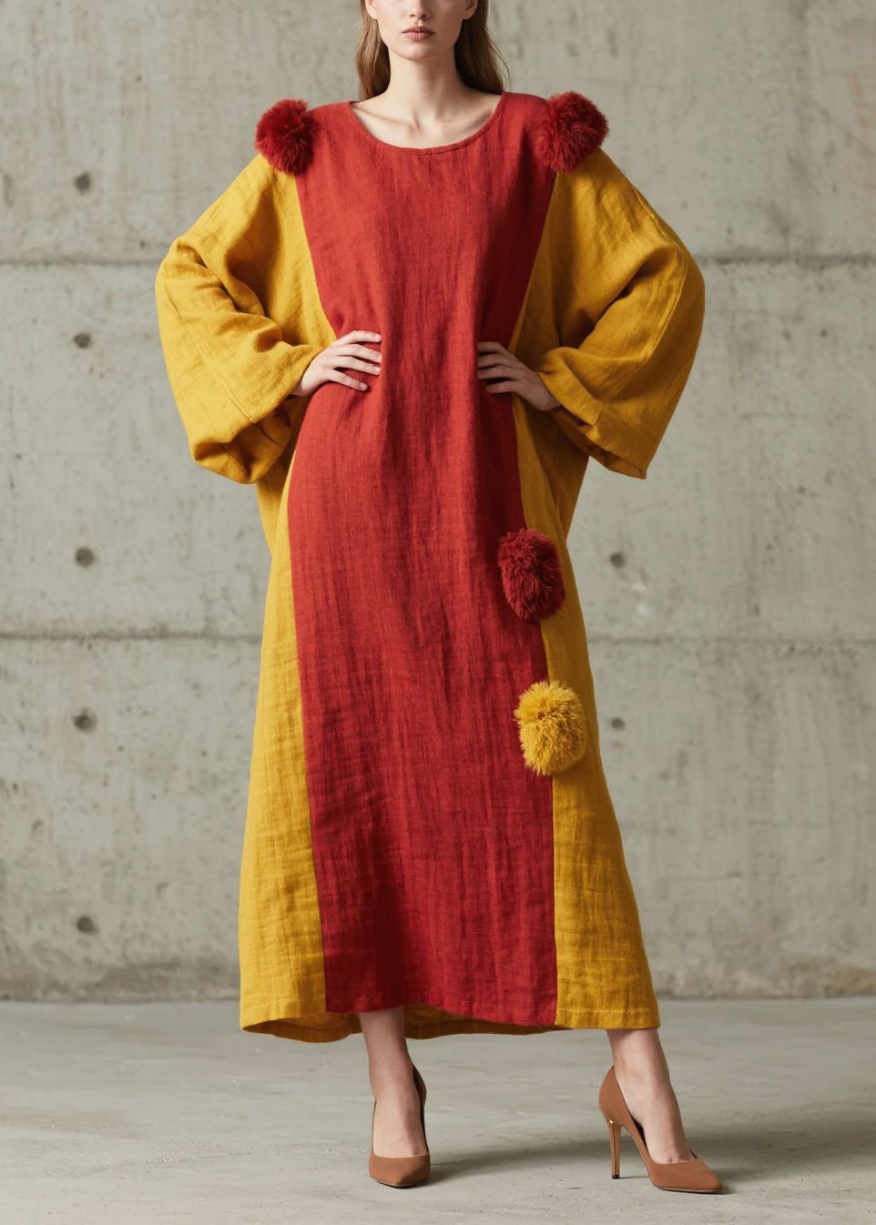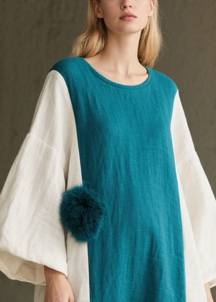 Colorblock Patchwork Cotton Dress Oversized Fuzzy Ball Decorated Lantern Sleeve