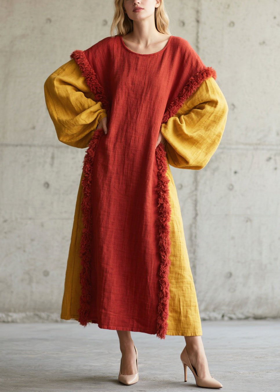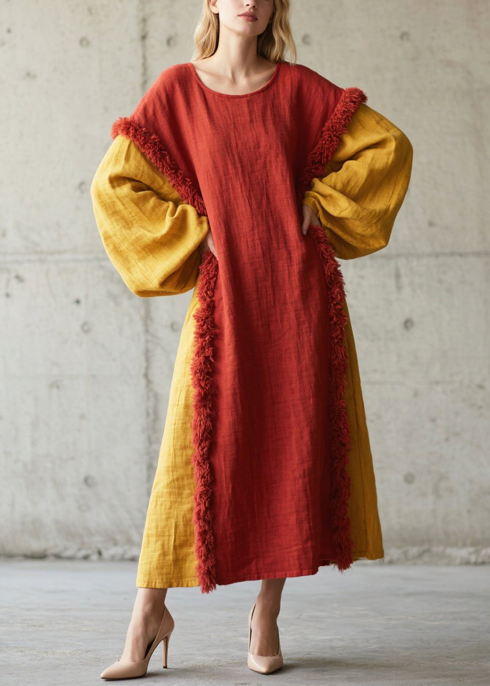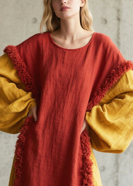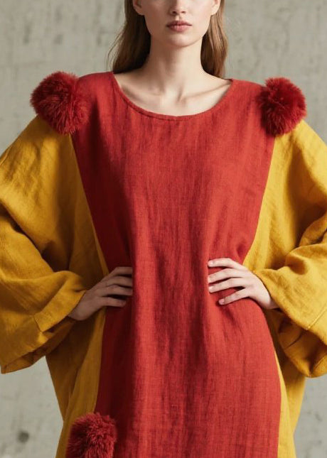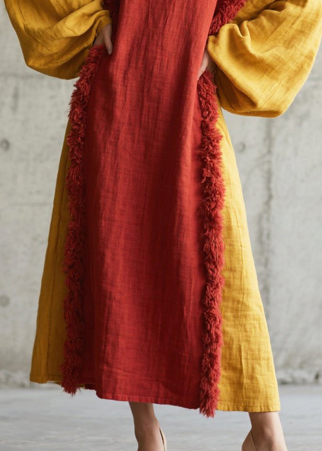 Red Patchwork Faux Fur Cotton Long Dress Oversized Fall