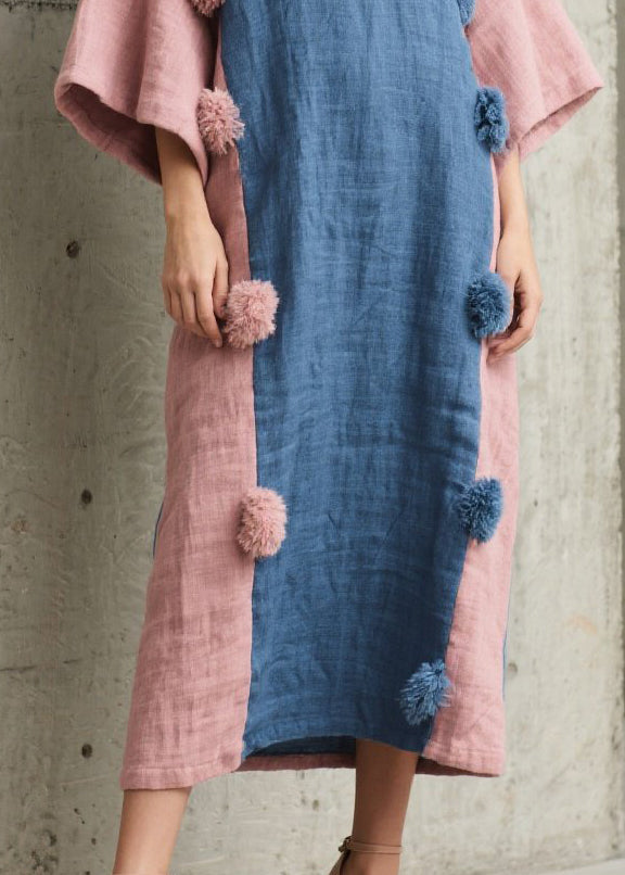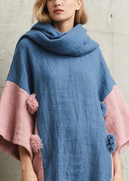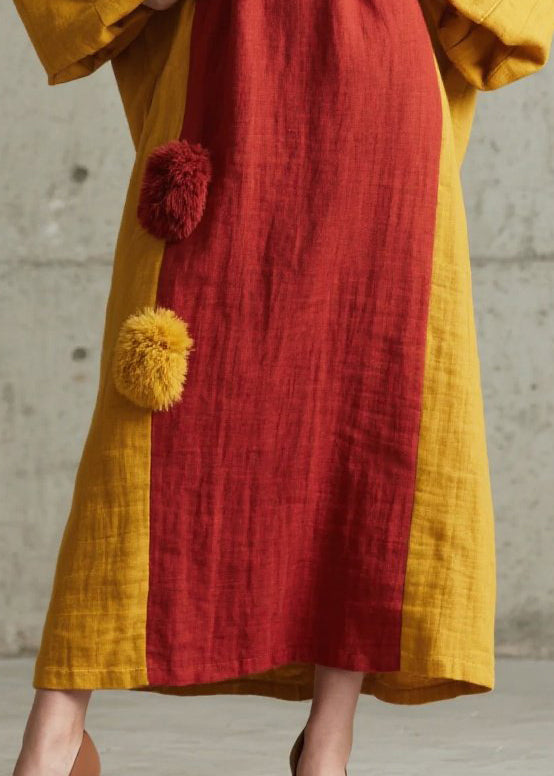 Fitted Mixed Color Patchwork Fuzzy Ball Decorated Cotton Robe Dresses Fall