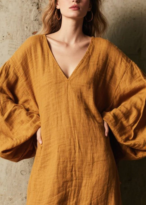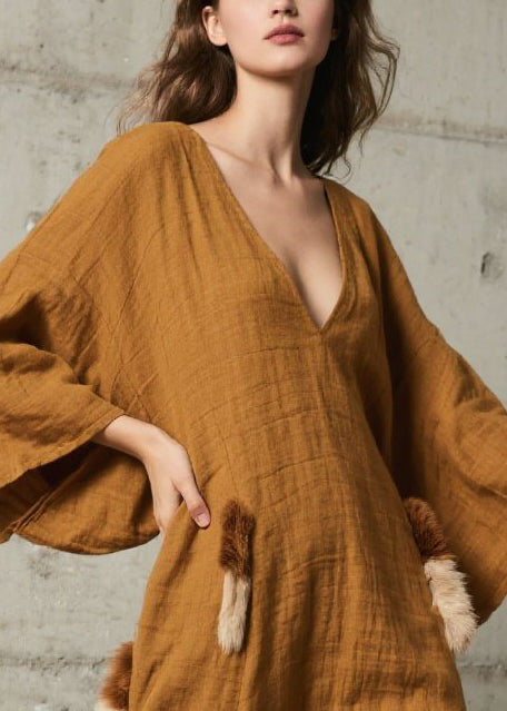 Unique Caramel V Neck Patchwork Faux Fur Robe Dresses Fall