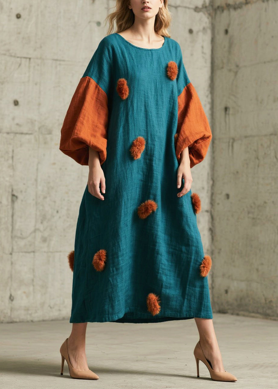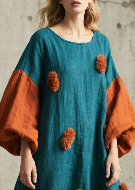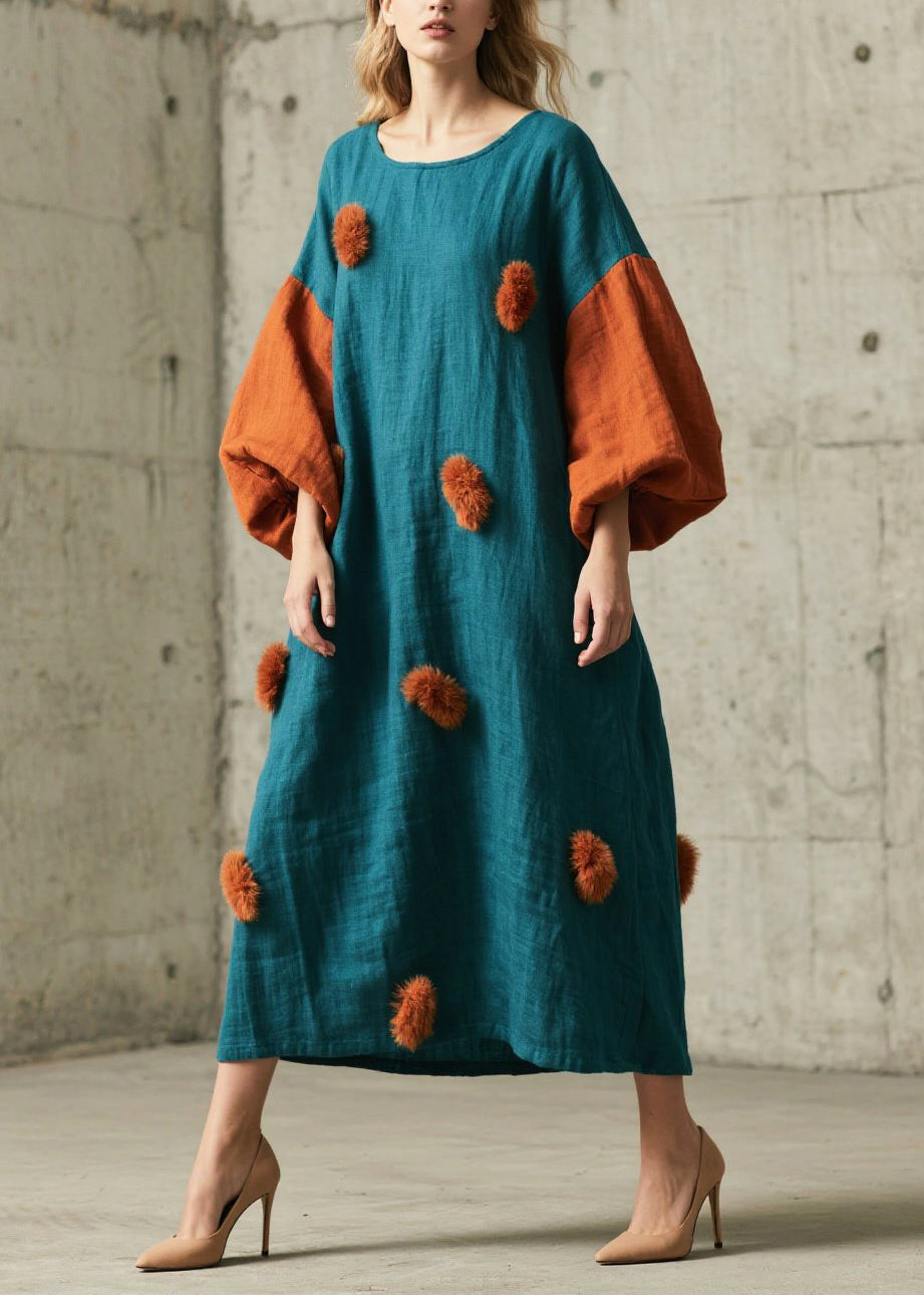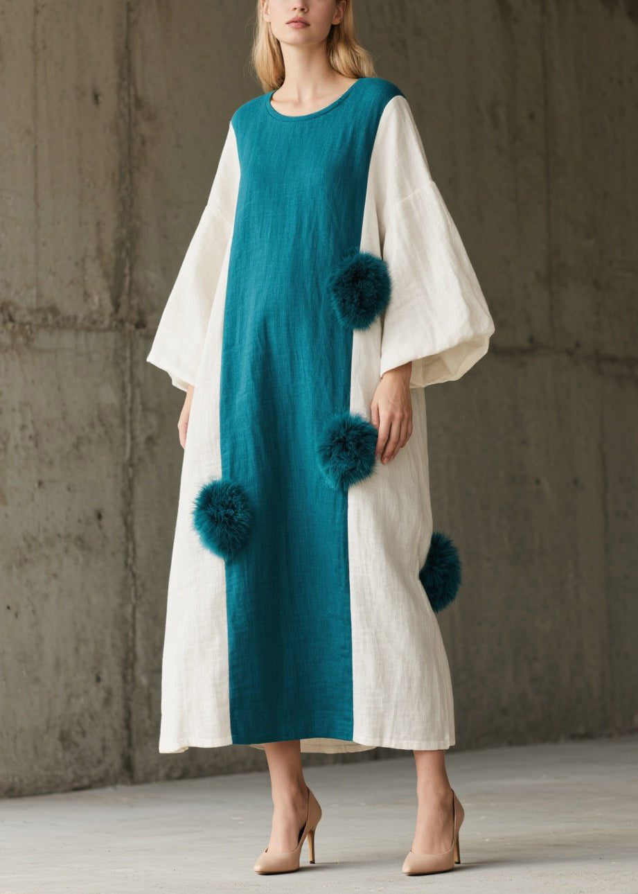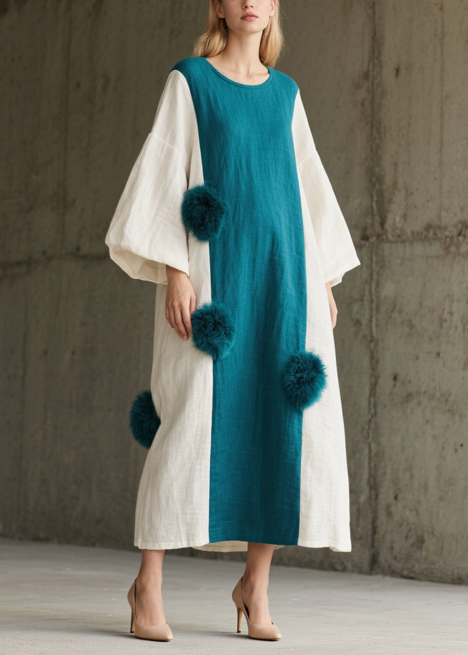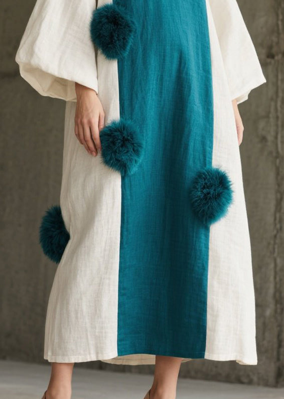 Peacock Blue Patchwork Dresses Oversized Fuzzy Ball Decorated Lantern Sleeve