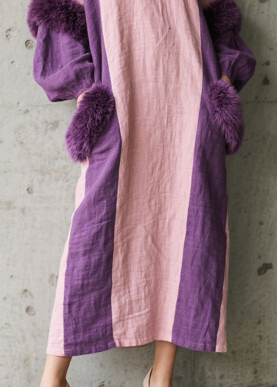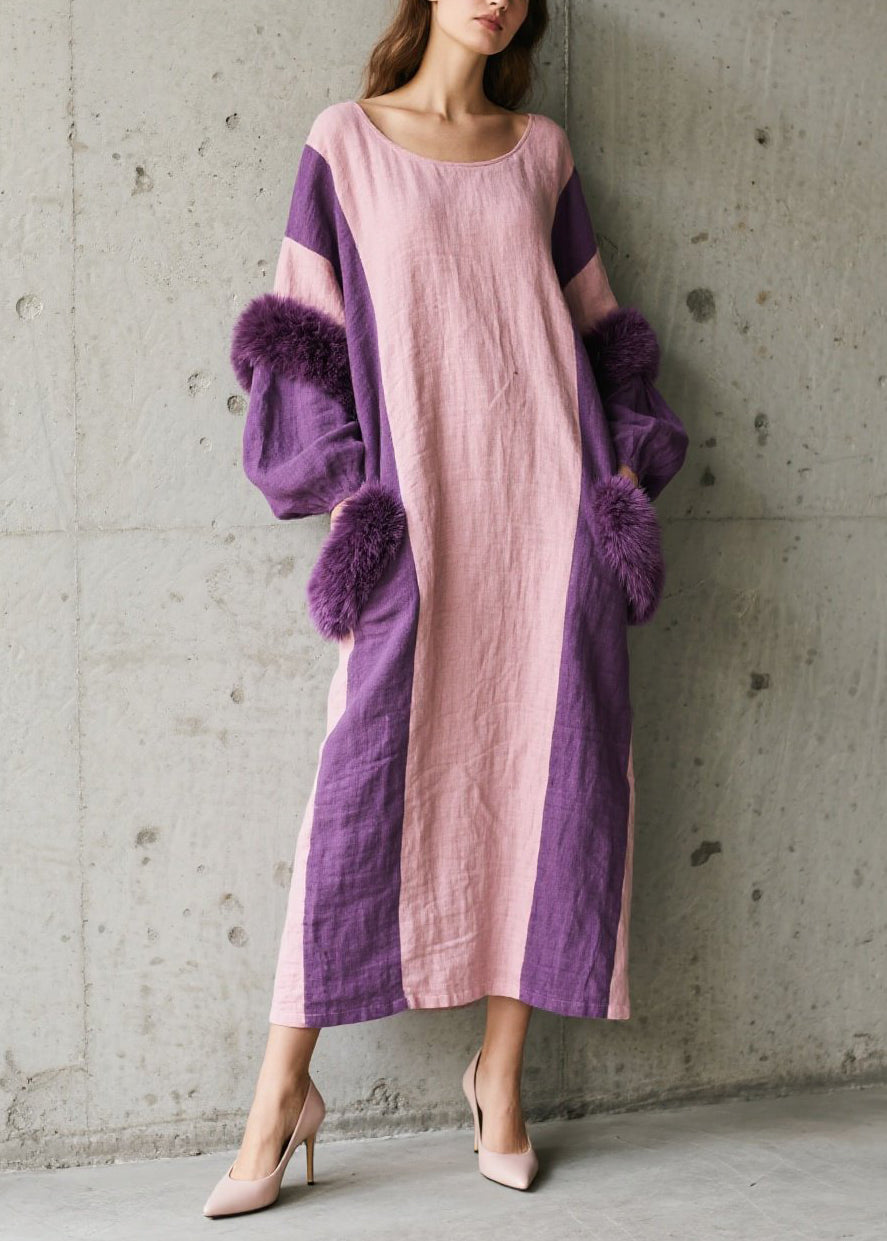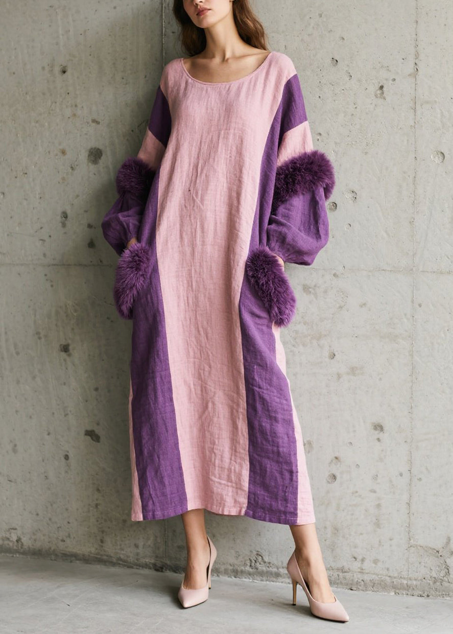 Style Colorblock Oversized Patchwork Faux Fur Long Dresses Fall