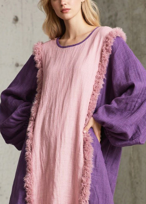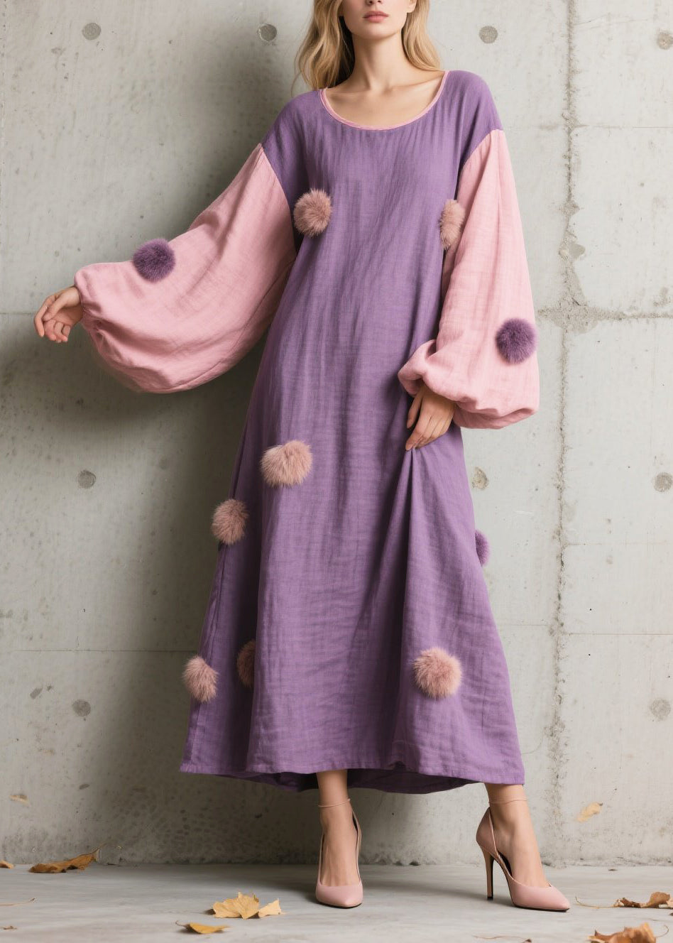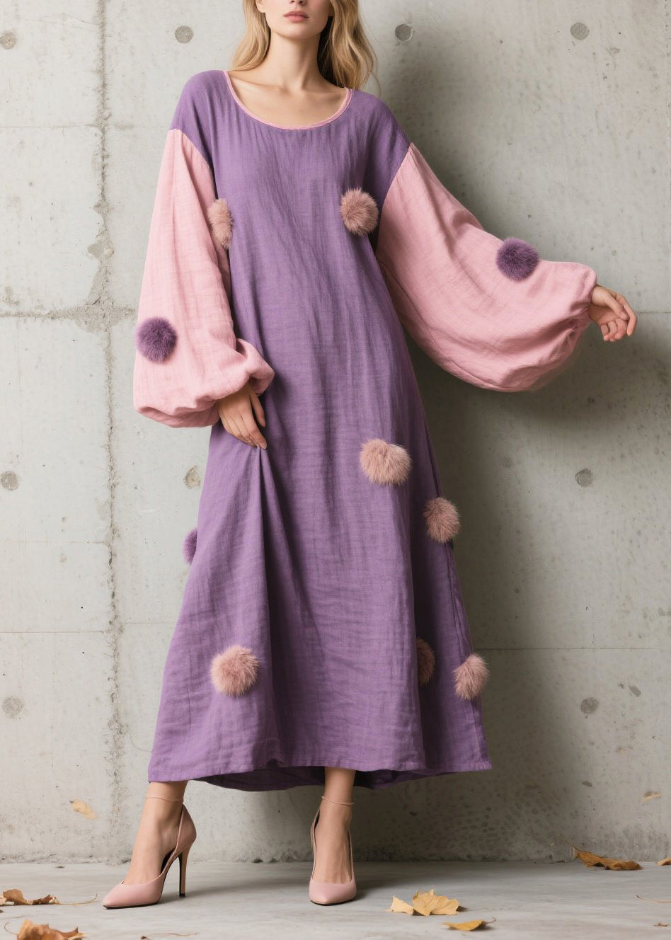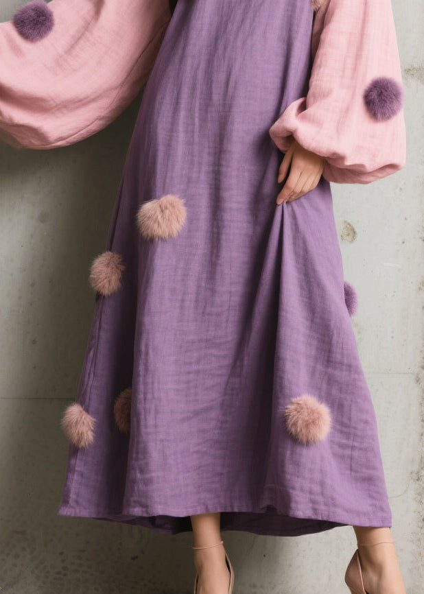 Chic Purple Oversized Patchwork Fuzzy Ball Decorated Long Dress Lantern Sleeve