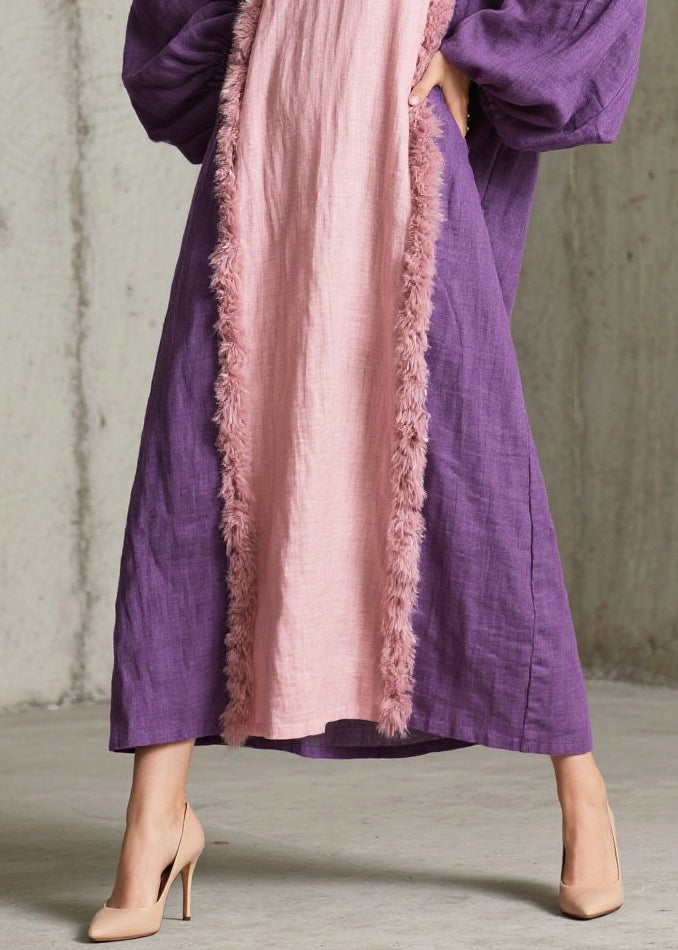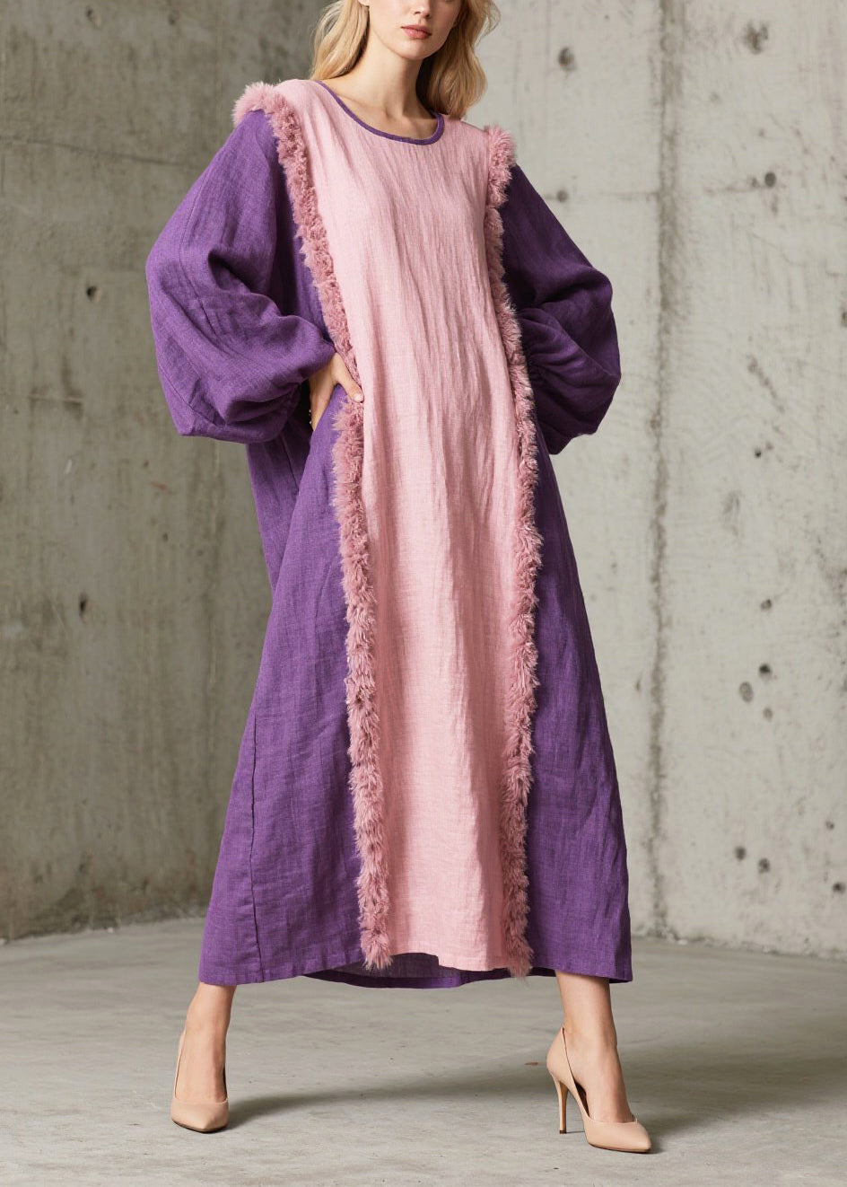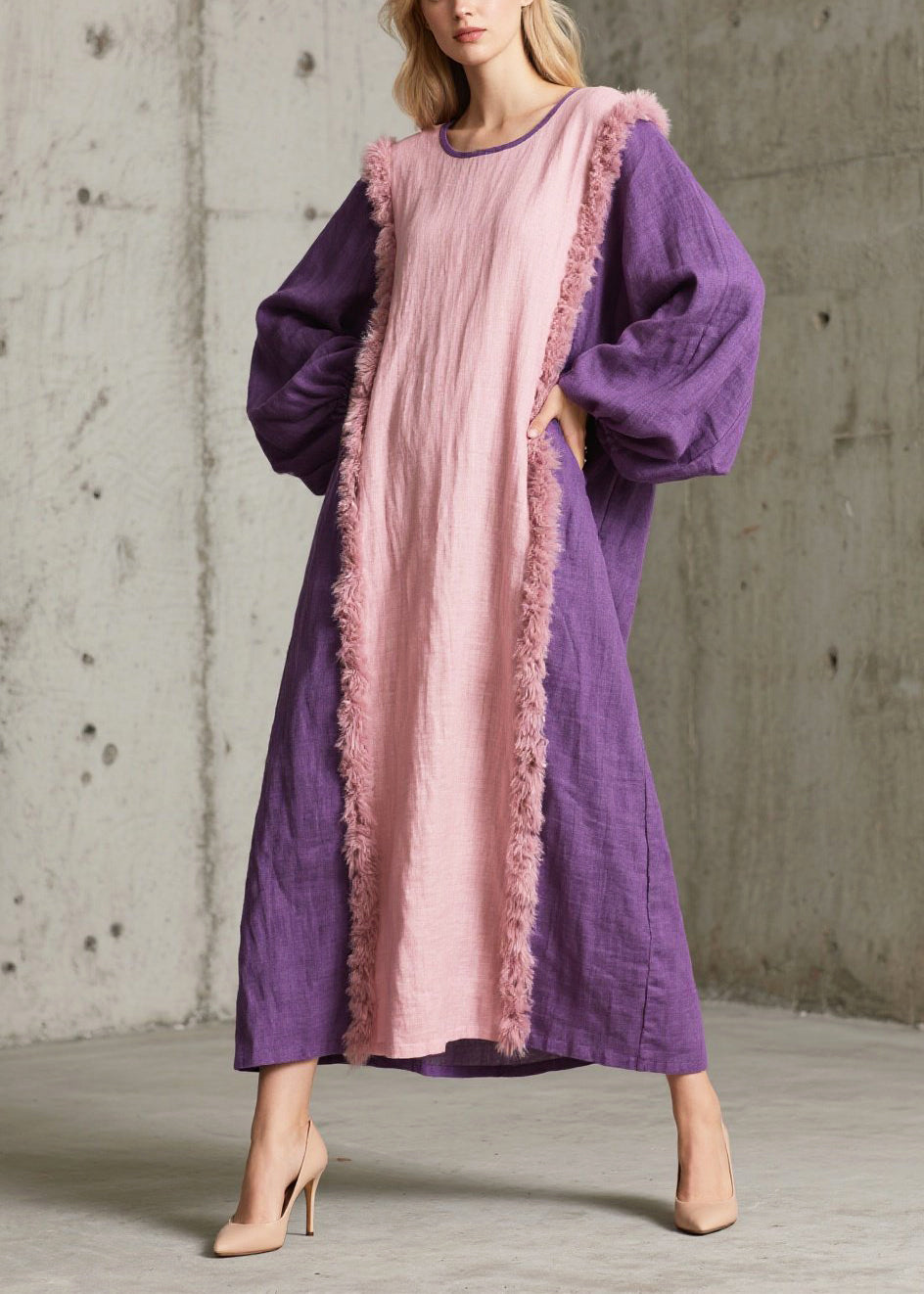 Chic Purple Oversized Patchwork Fuzzy Ball Decorated Long Dress Lantern Sleeve
