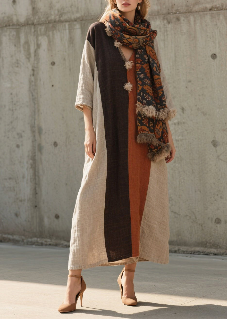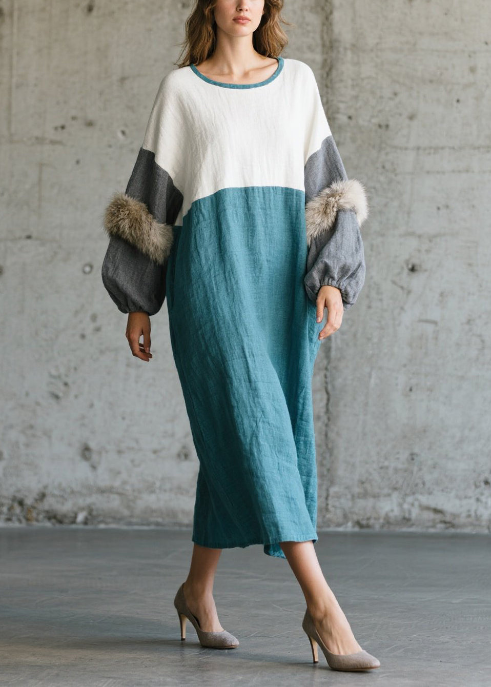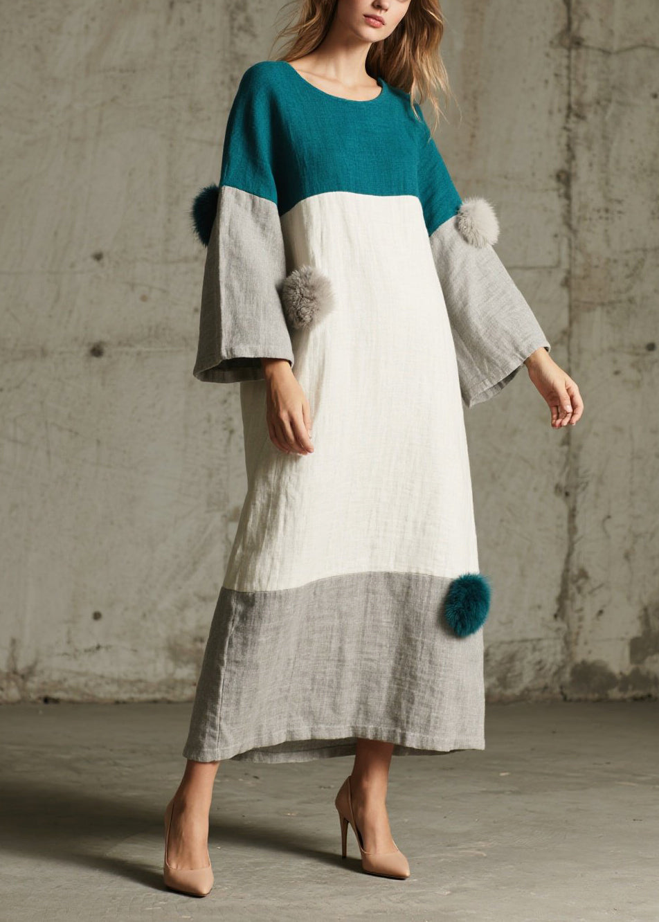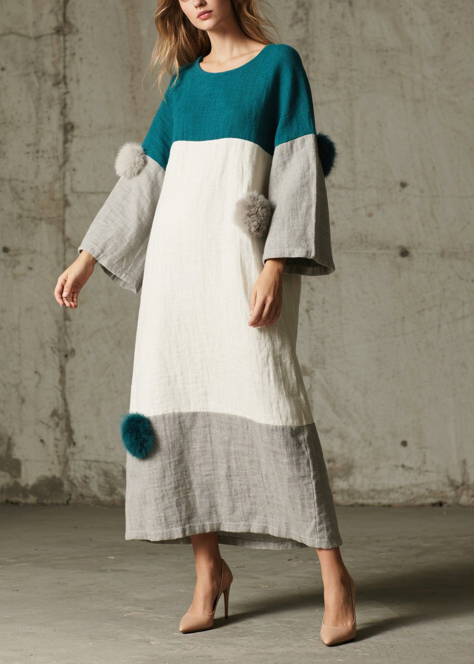 Vintage Colorblock Oversized Patchwork Cotton Long Dresses Bracelet Sleeve