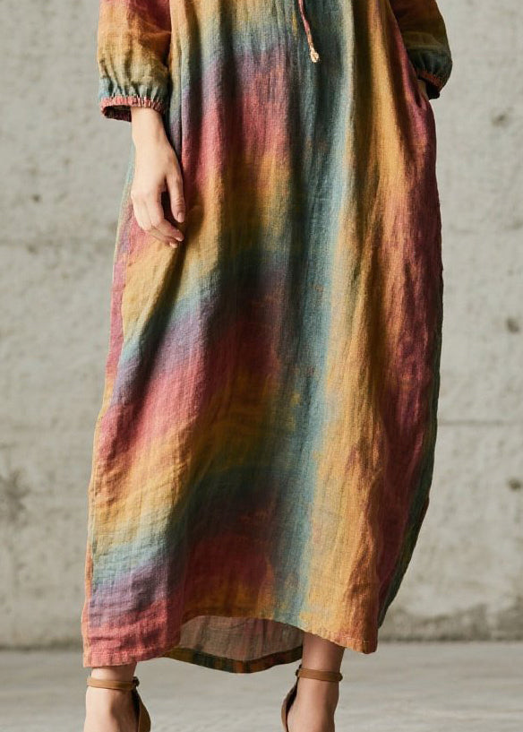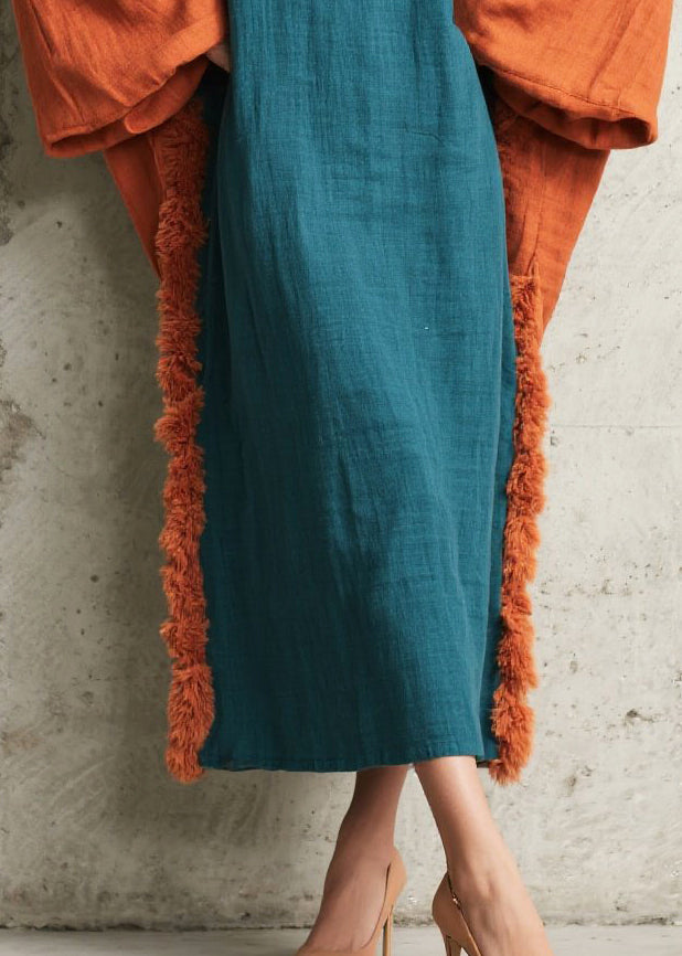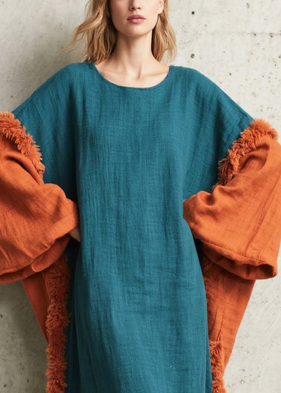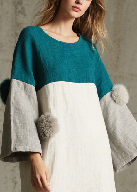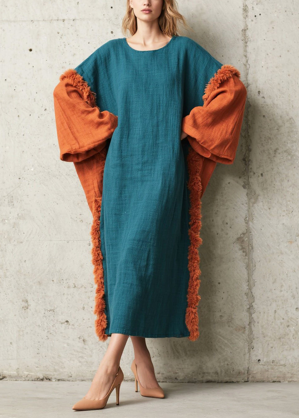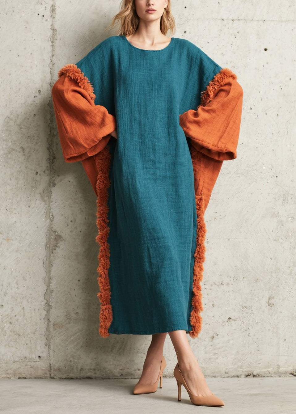 Vintage Colorblock Oversized Patchwork Cotton Long Dresses Bracelet Sleeve
