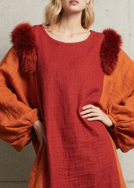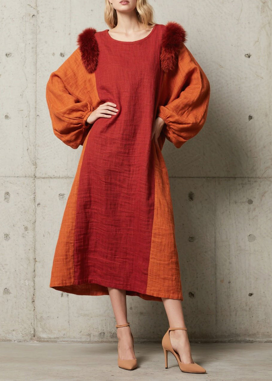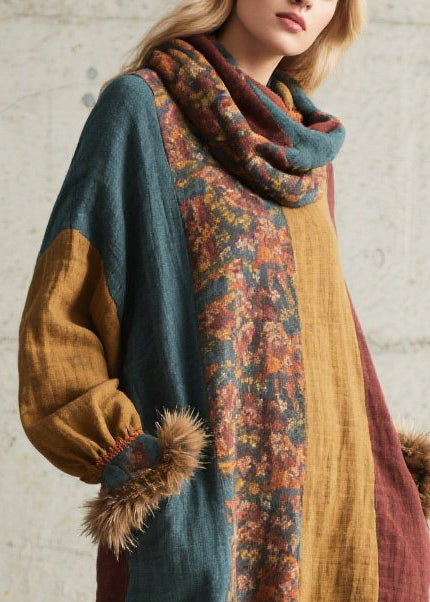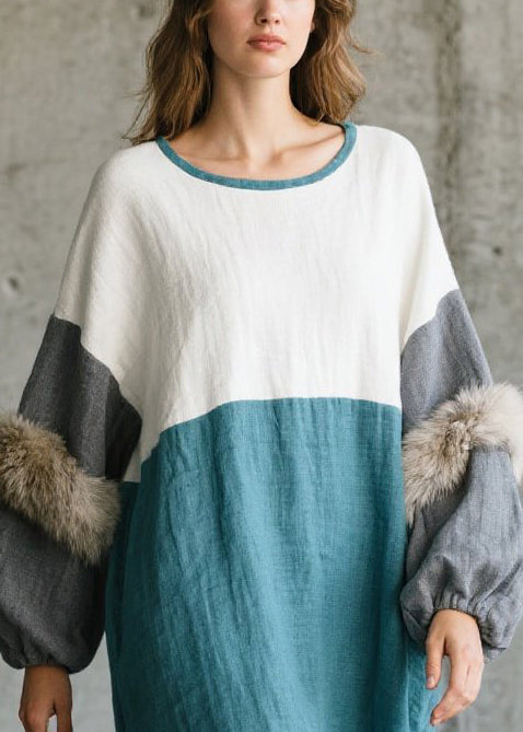 Chic Colorblock Oversized Patchwork Faux Fur Ankle Dress Fall