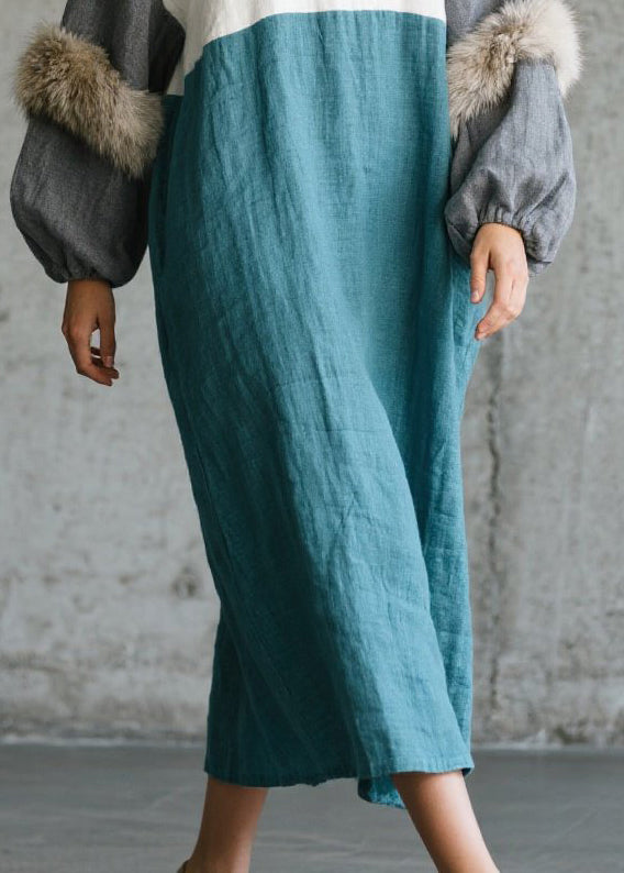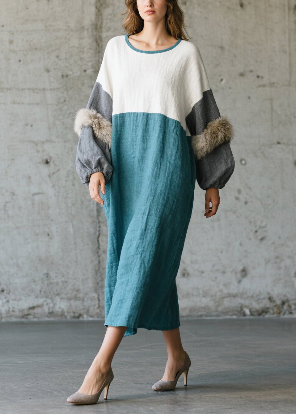 Vintage Peacock Blue Oversized Patchwork Faux Fur Dresses Fall