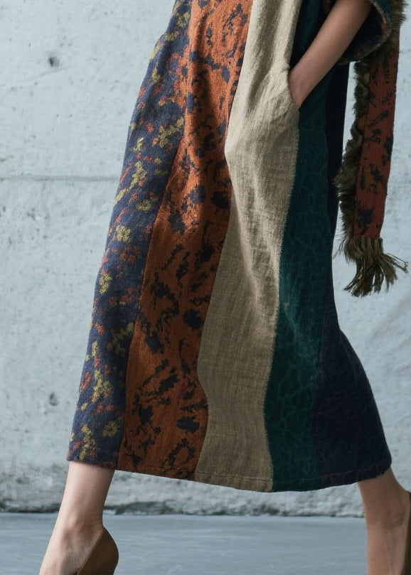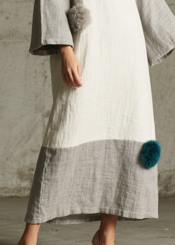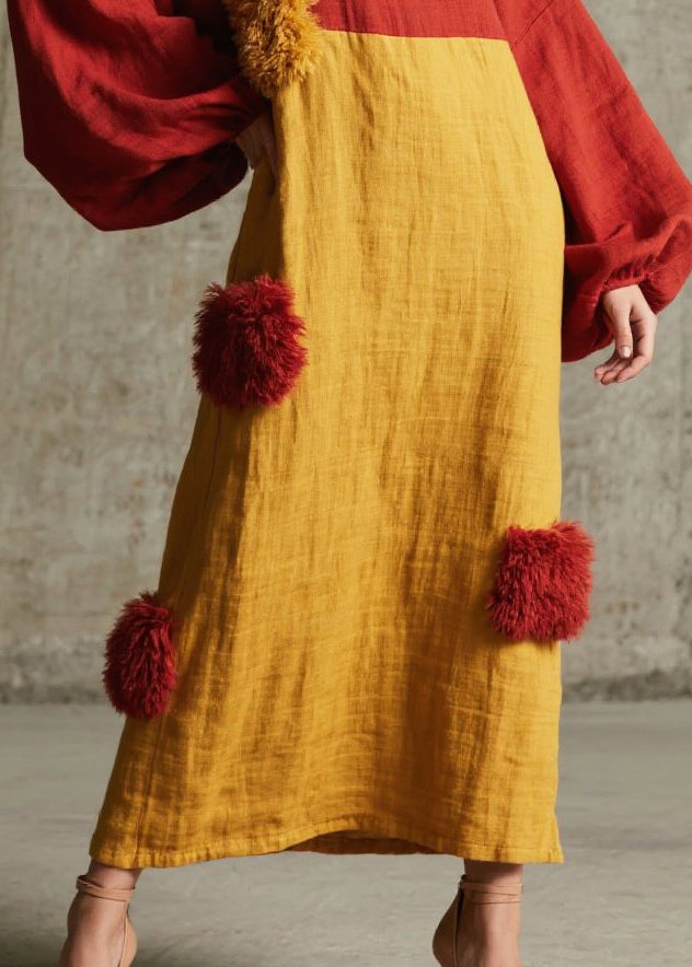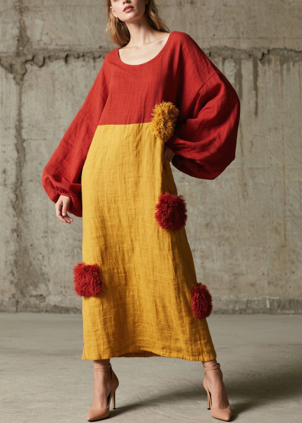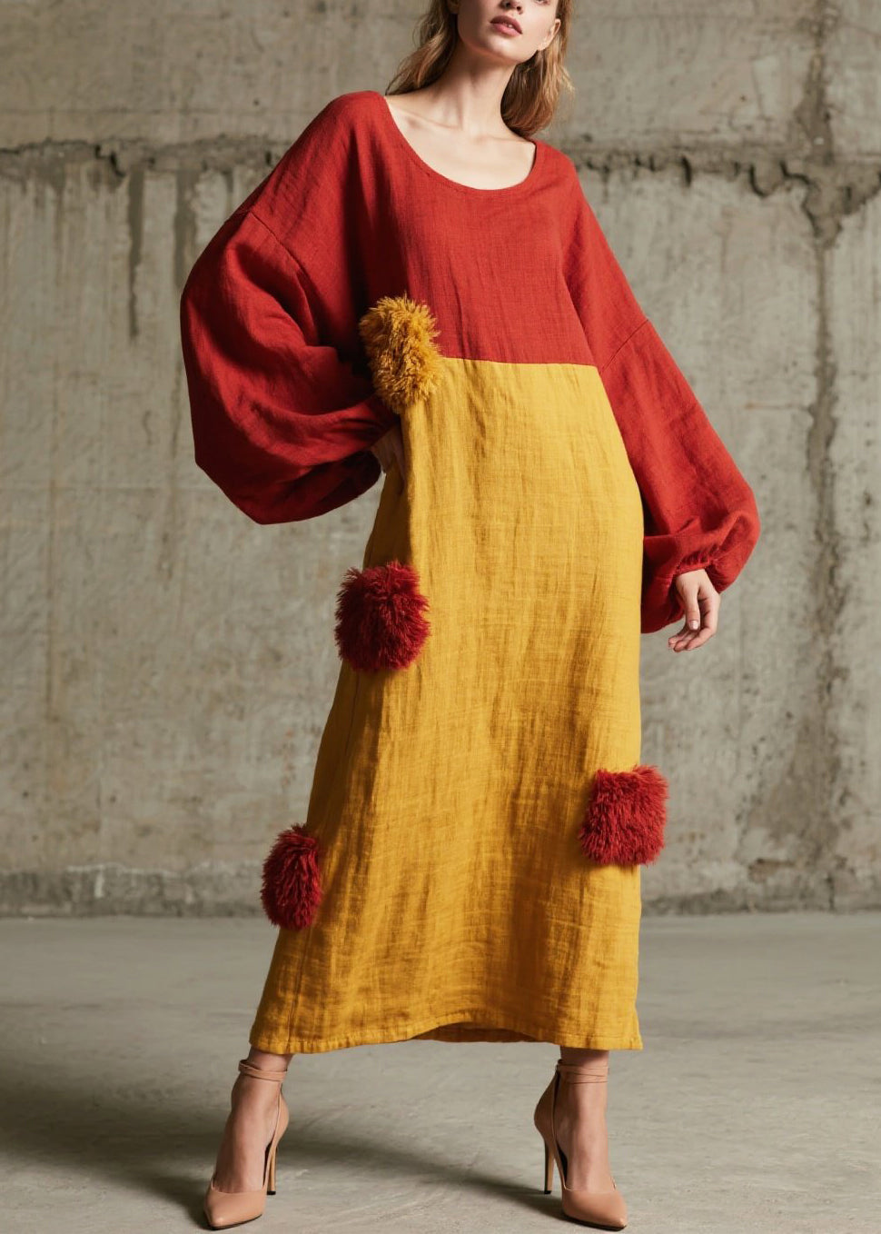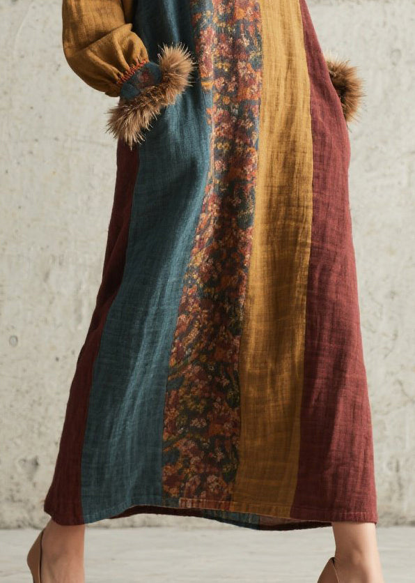Vintage Colorblock Oversized Patchwork Fuzzy Ball Decorated Maxi Dress Fall