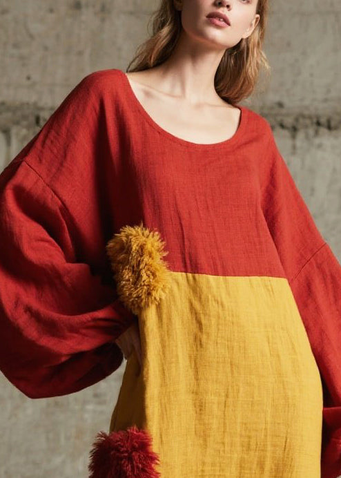 Colorblock Patchwork Maxi Dresses Oversized Fuzzy Ball Decorated Fall