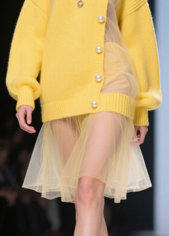 Fine Yellow Big Pearl Patchwork Tulle Knitted Dress Winter