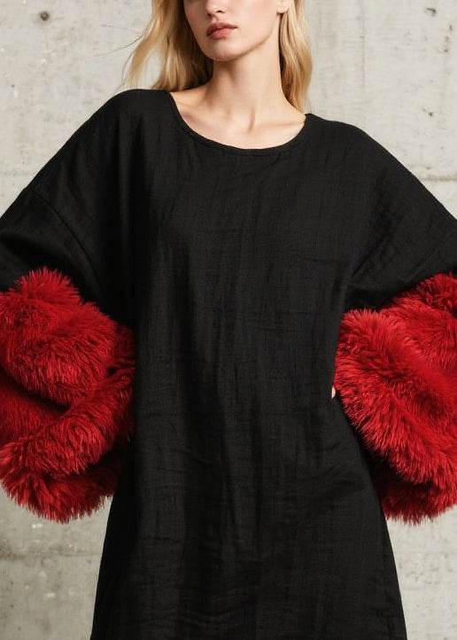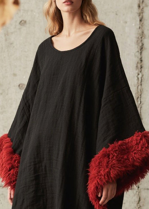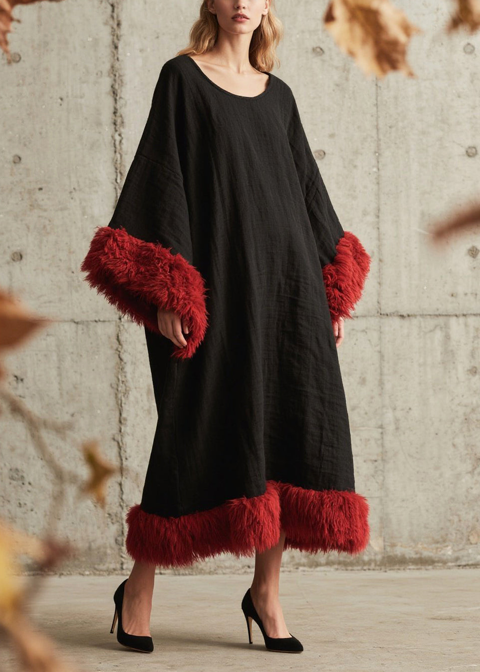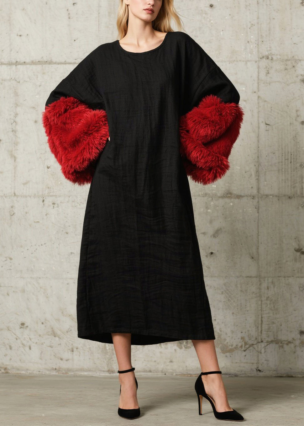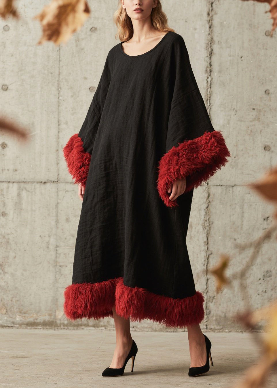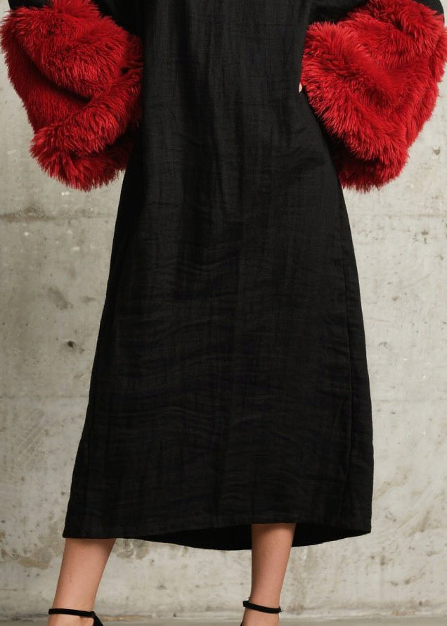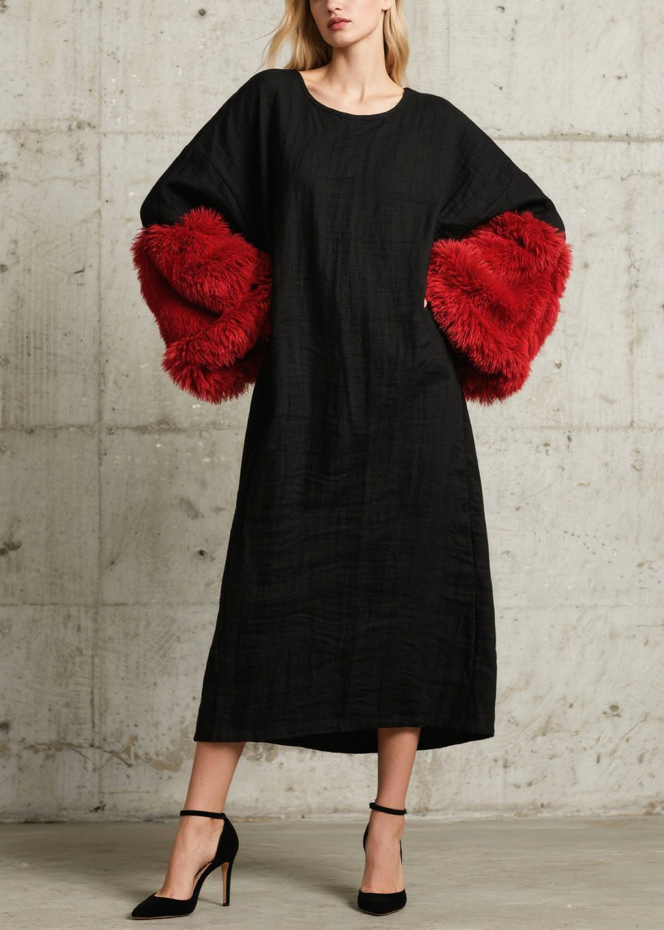 Plus Size Black Oversized Patchwork Faux Fur Ankle Dress Fall