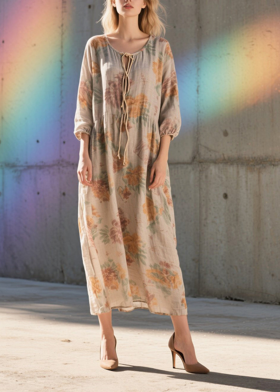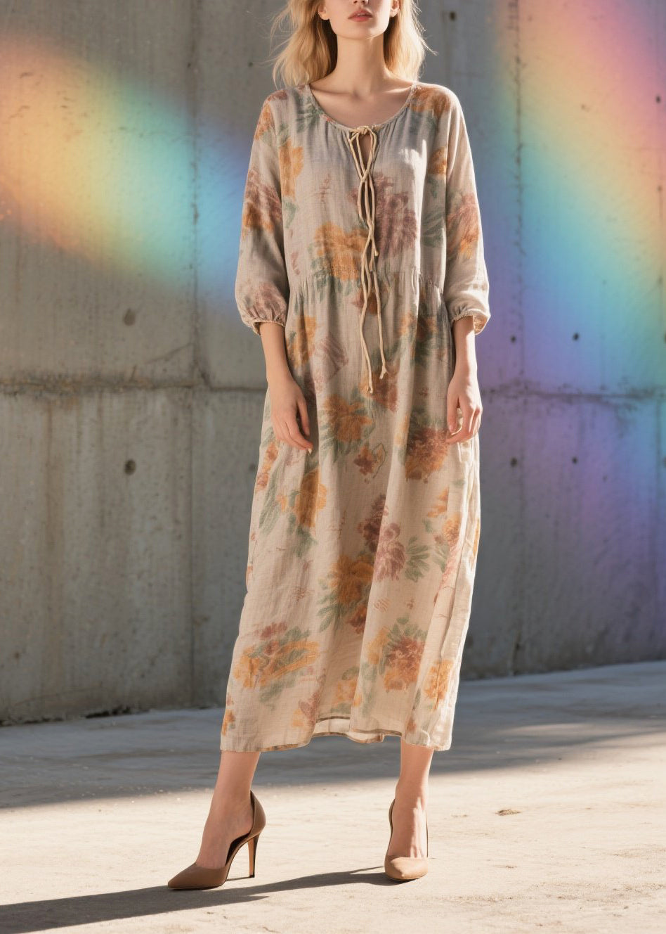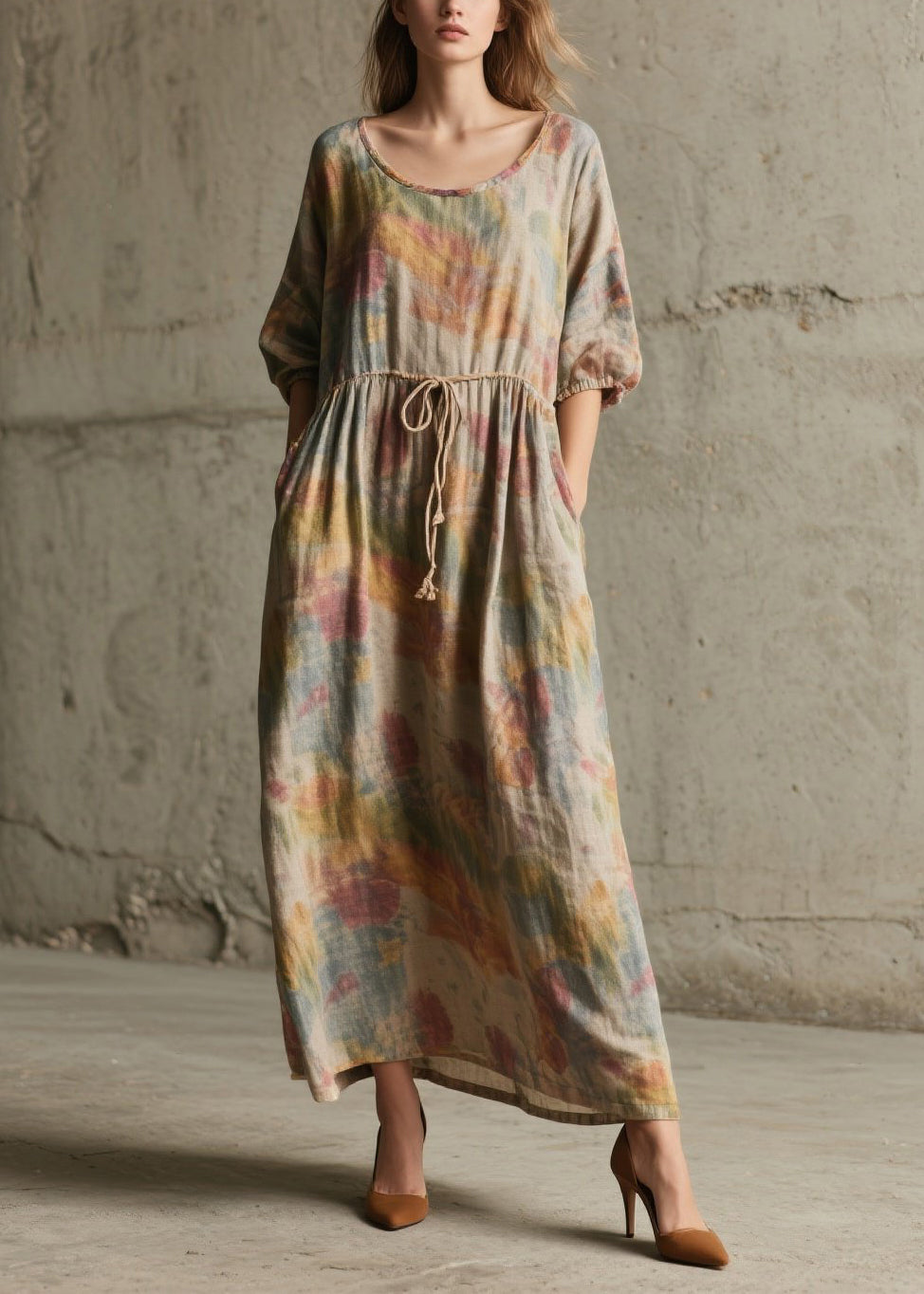 Art Mixed Color Tie Waist Print Cotton Long Dresses Summer