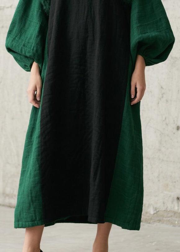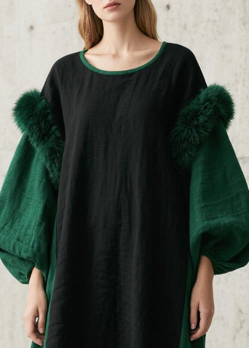 Simple Green Oversized Patchwork Faux Fur Dresses Lantern Sleeve