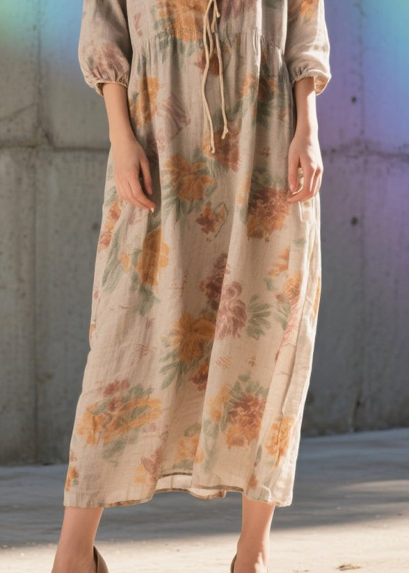 Natural Khaki Cinched Print Cotton Robe Dresses Half Sleeve